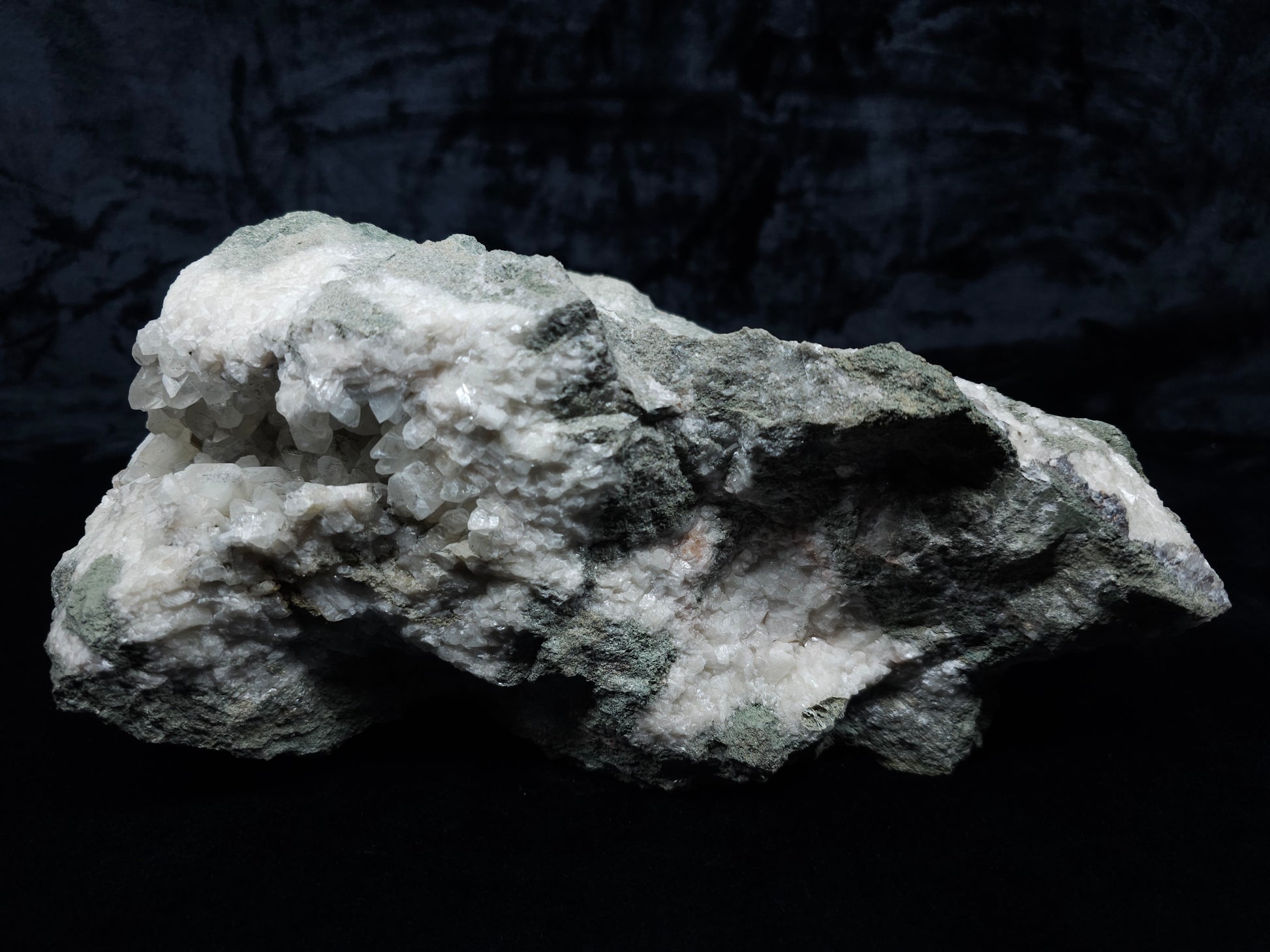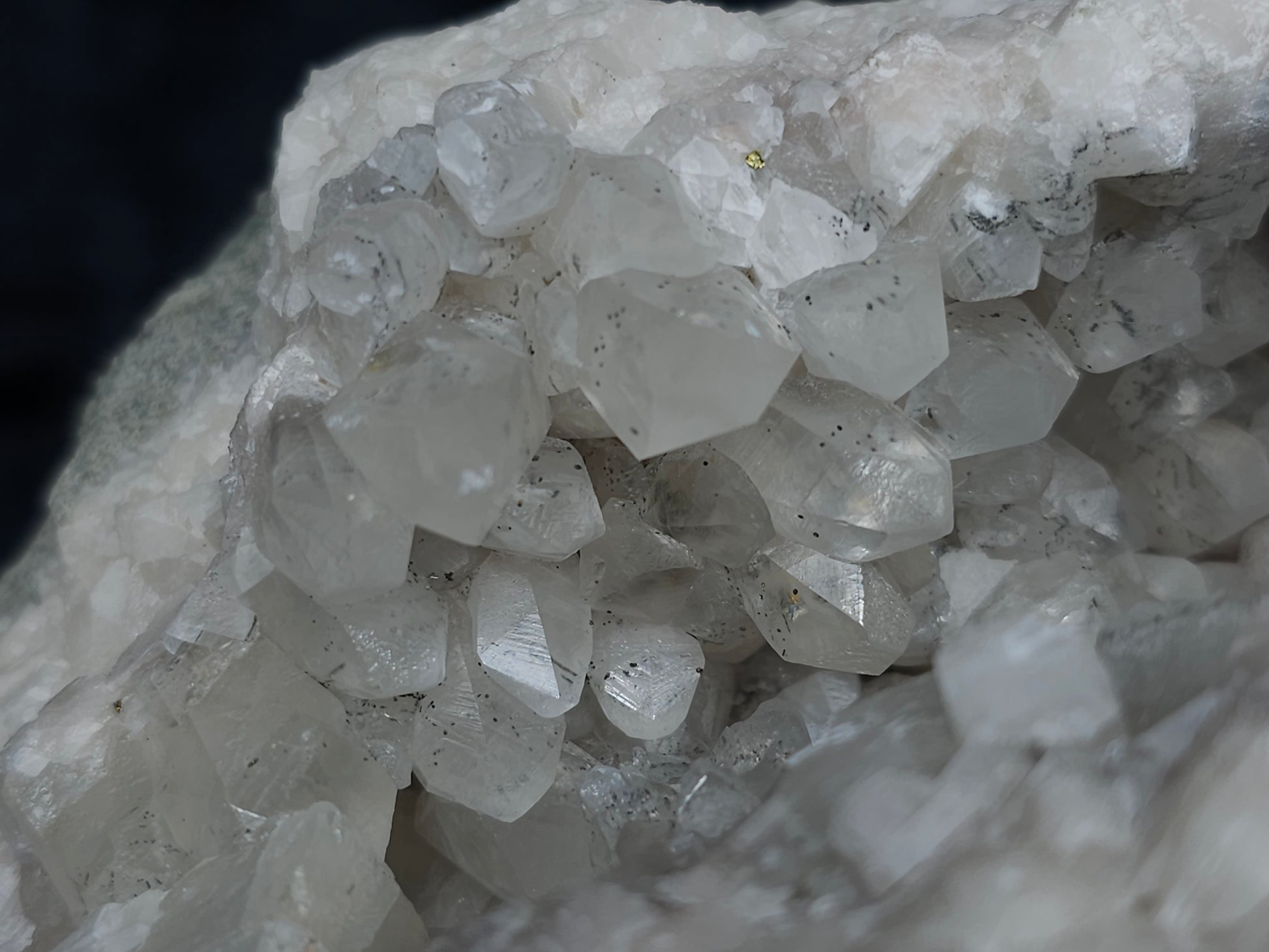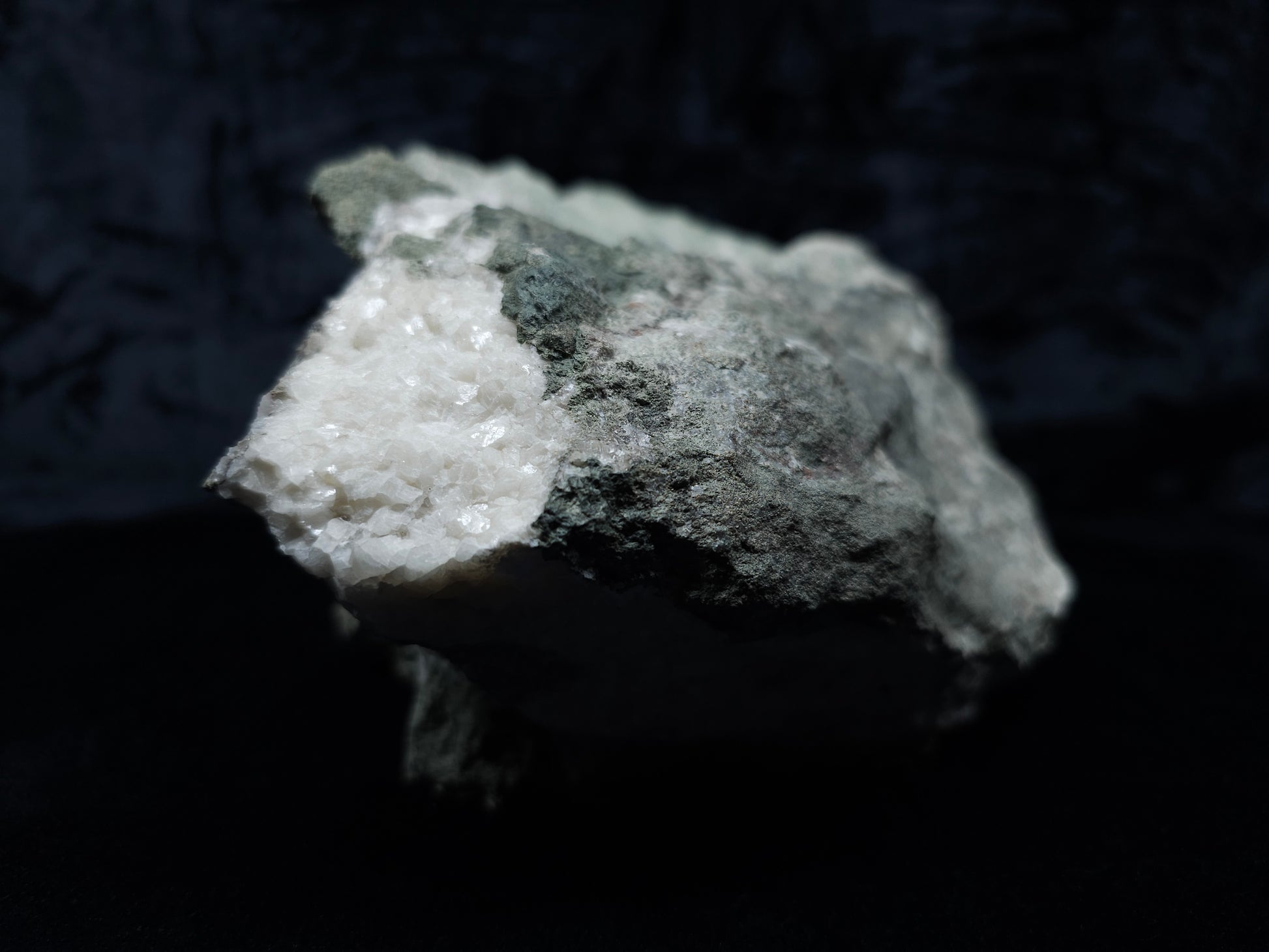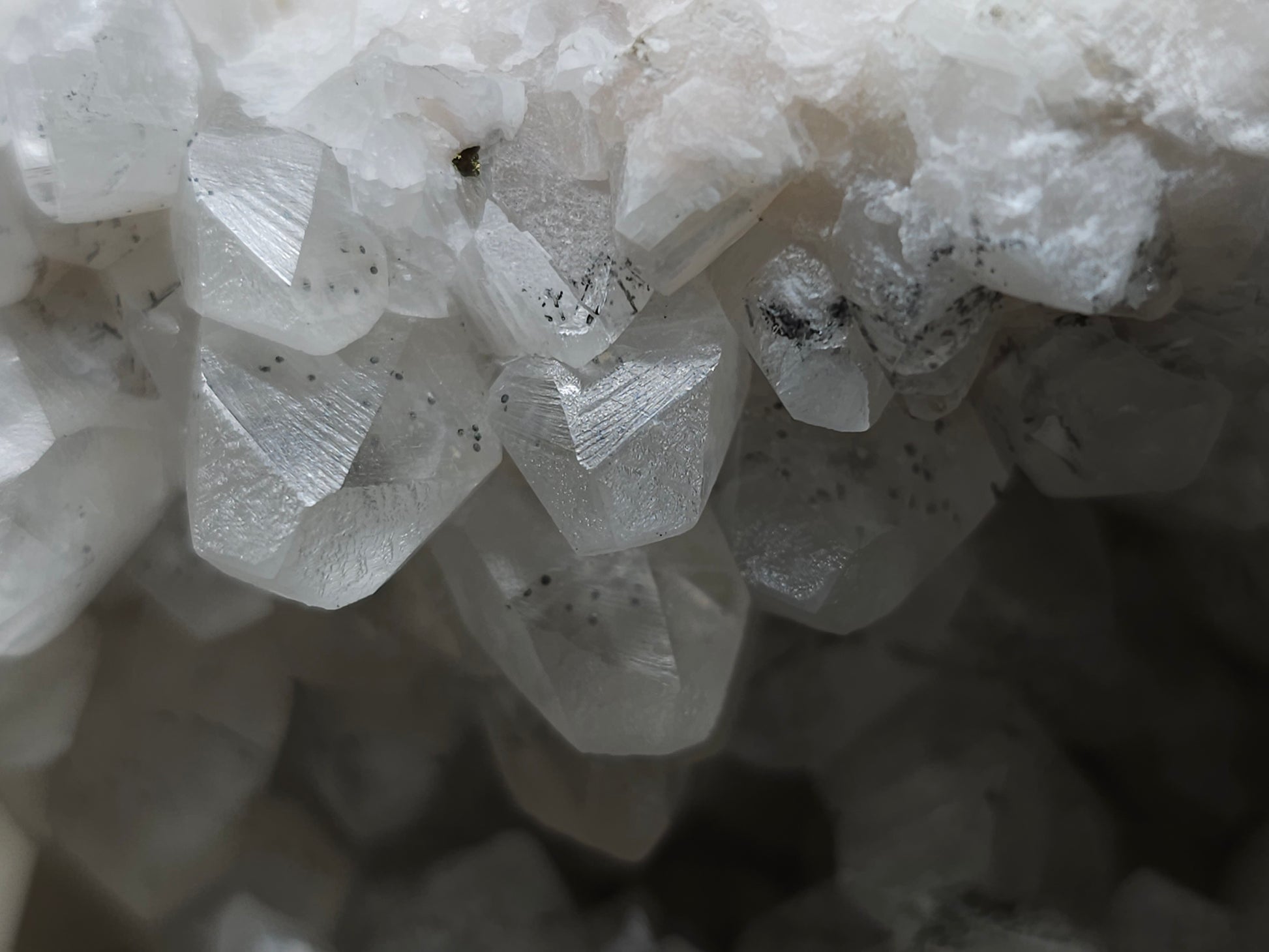 Prepare to be enchanted by this unique treasure: Behold the one-of-a-kind presence of Chalcopyrite and Hematite adorning a clear, glossy Combined form Calcite formation, nestled upon a bed of white Calcite and Sedimentary matrix. Enhanced by the gentle glow of 365nm light, this specimen emanates a subtle allure, inviting you to marvel at its singular beauty.