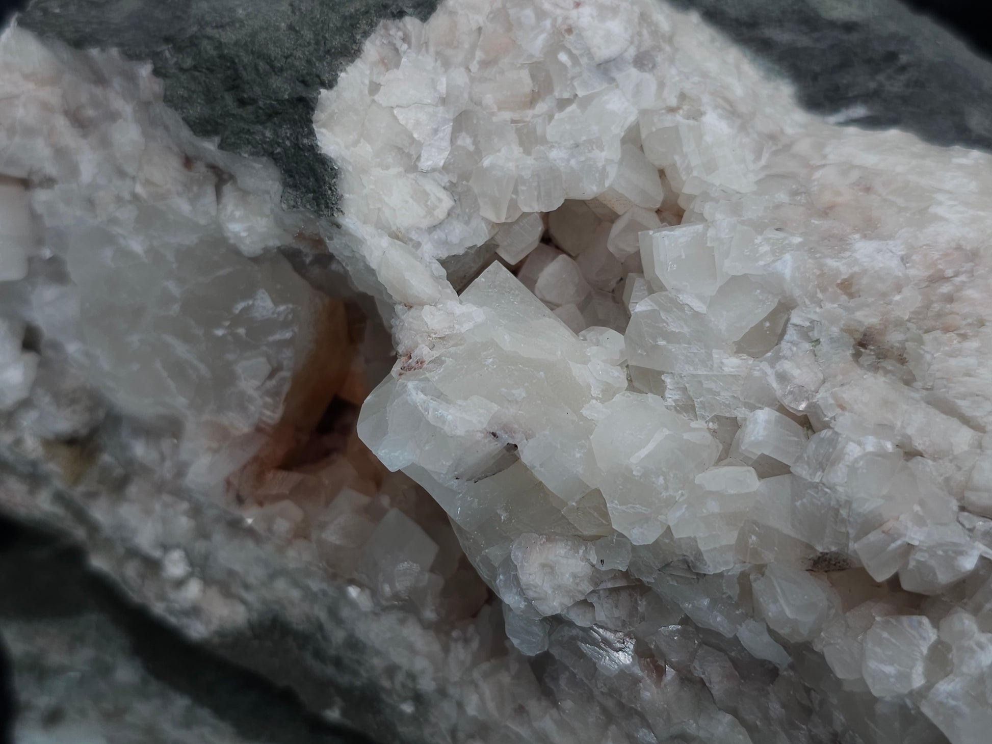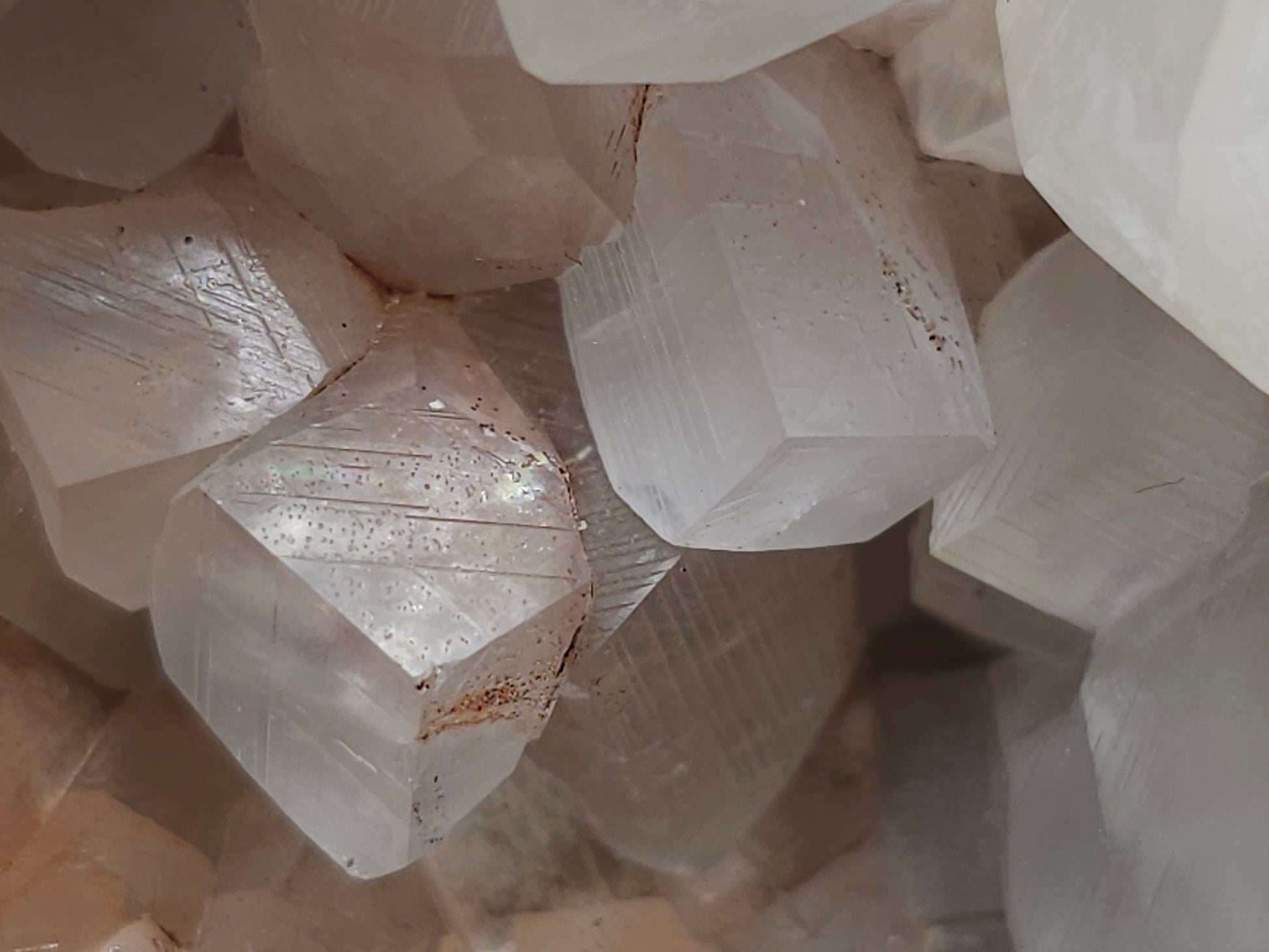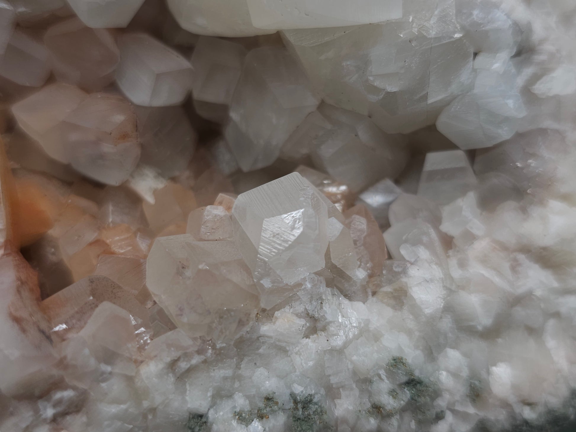 #11072 White and clear Combined form Calcite with Hematite inclusions on matrix