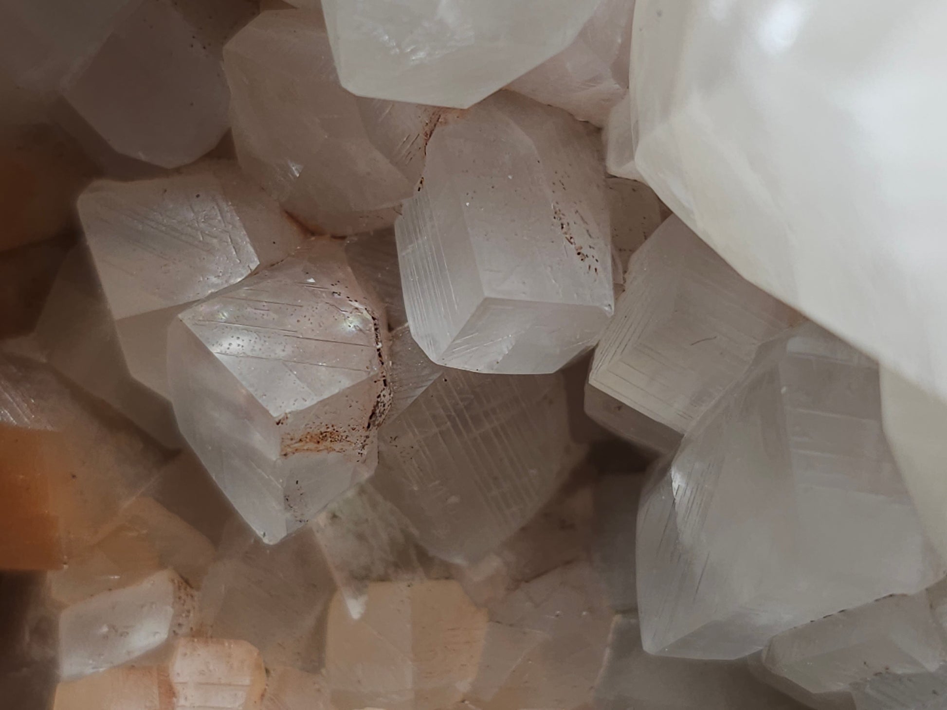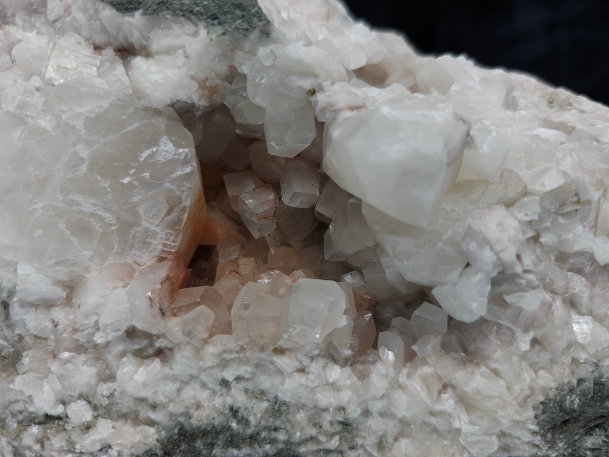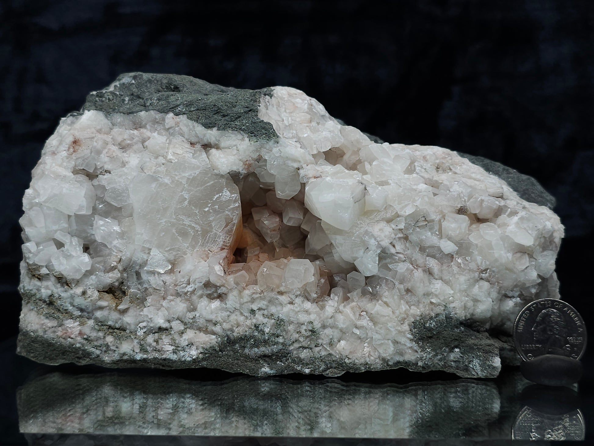 #11072 White and clear Combined form Calcite with Hematite inclusions on matrix