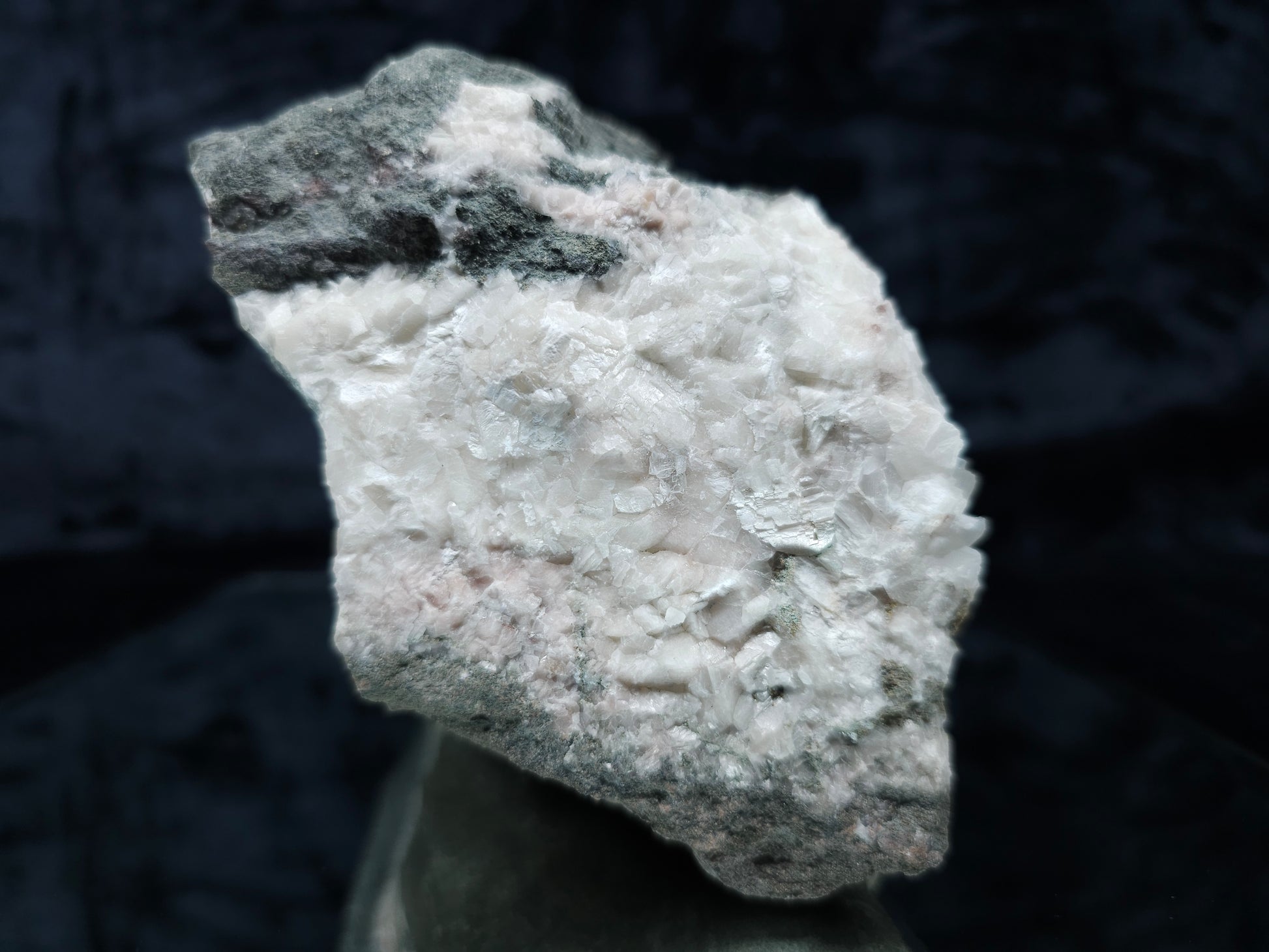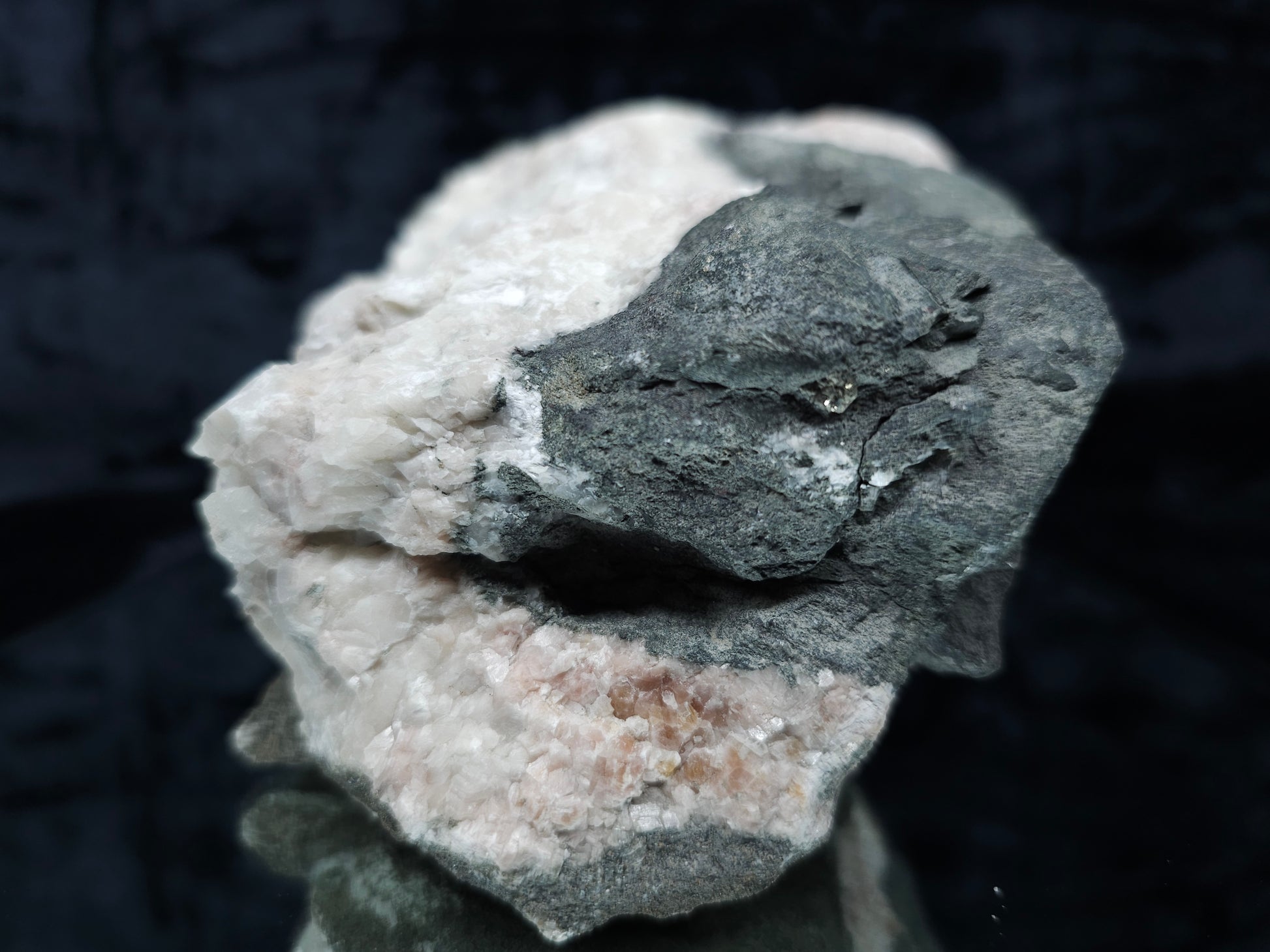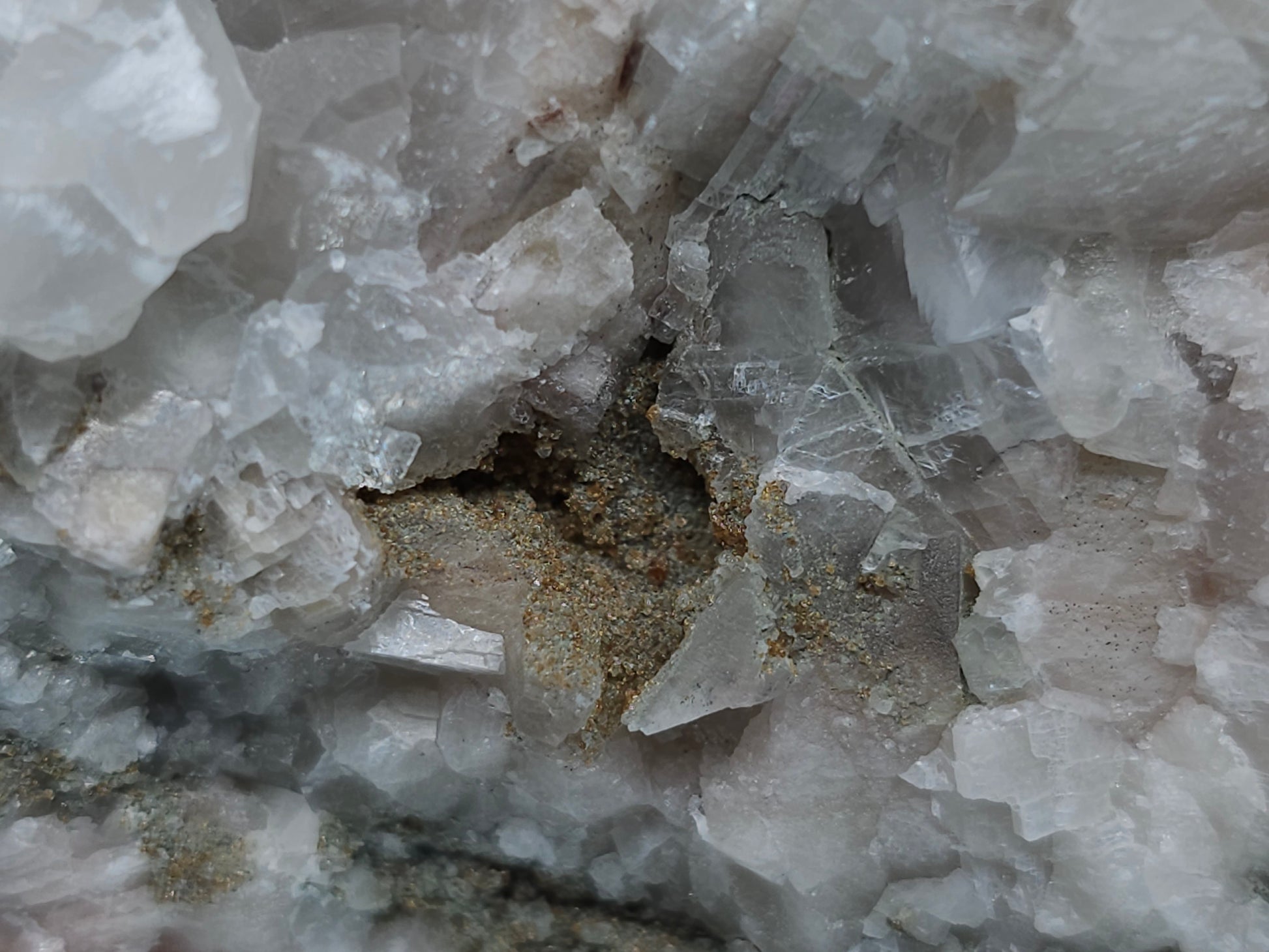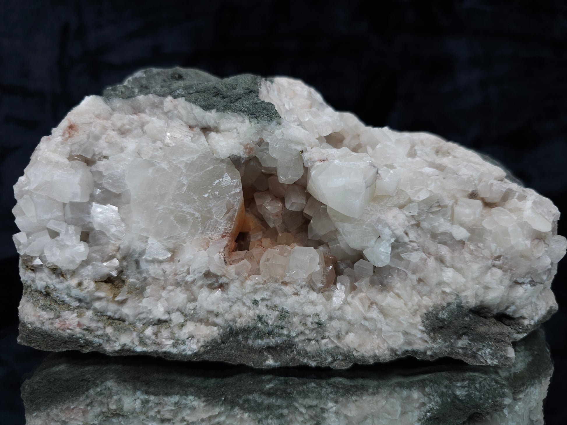 Indulge in the captivating allure of this breathtaking discovery: Feast your eyes upon the ravishing beauty of white and clear Combined form Calcite adorned with Iron oxide and Hematite inclusions, nestled among white Calcite and Sedimentary matrix, accompanied by a small Pyrite formation. Enhanced by the gentle glow of 365nm light, this specimen emanates an enchanting radiance, inviting you to immerse yourself in its natural splendor.