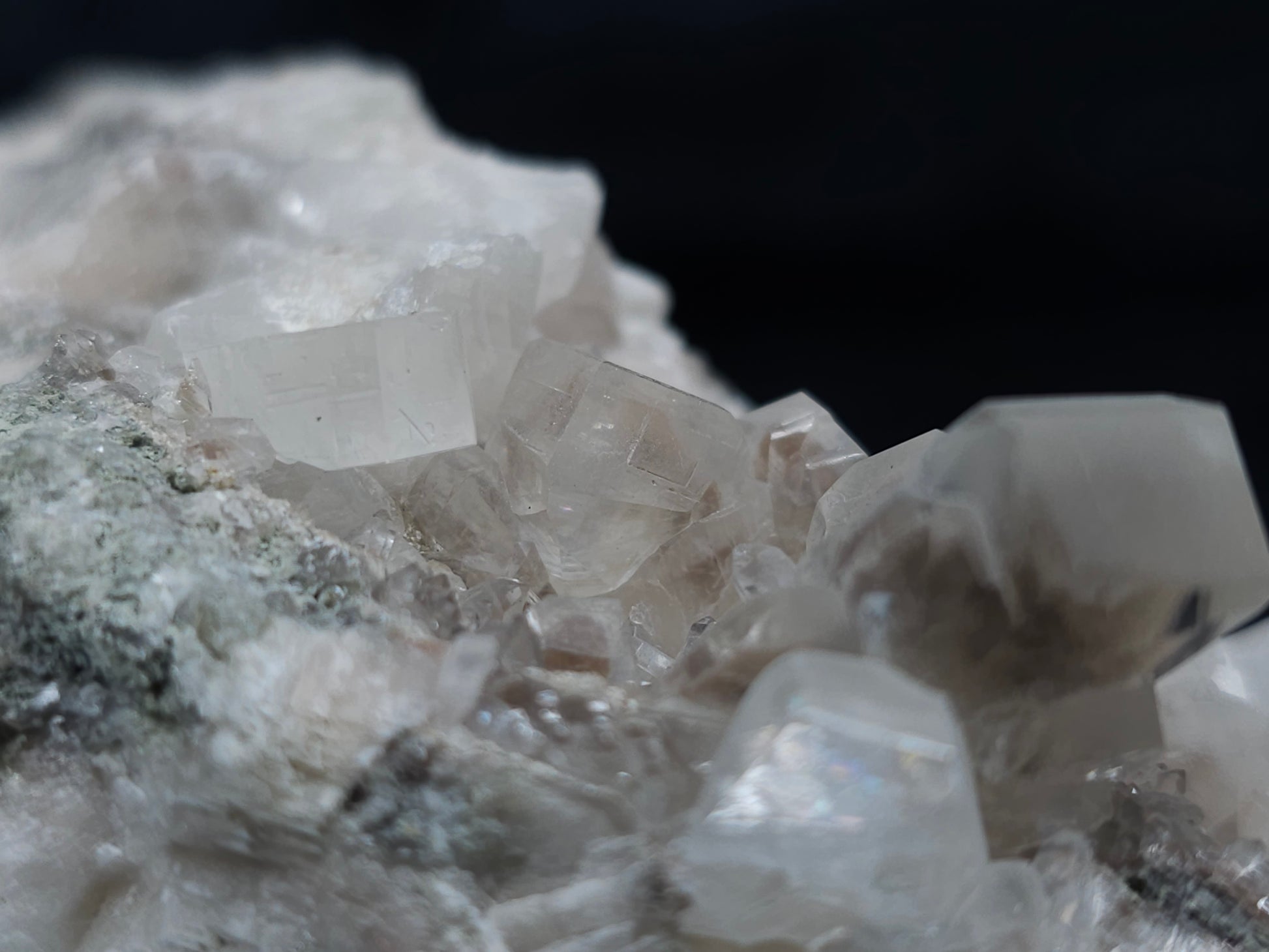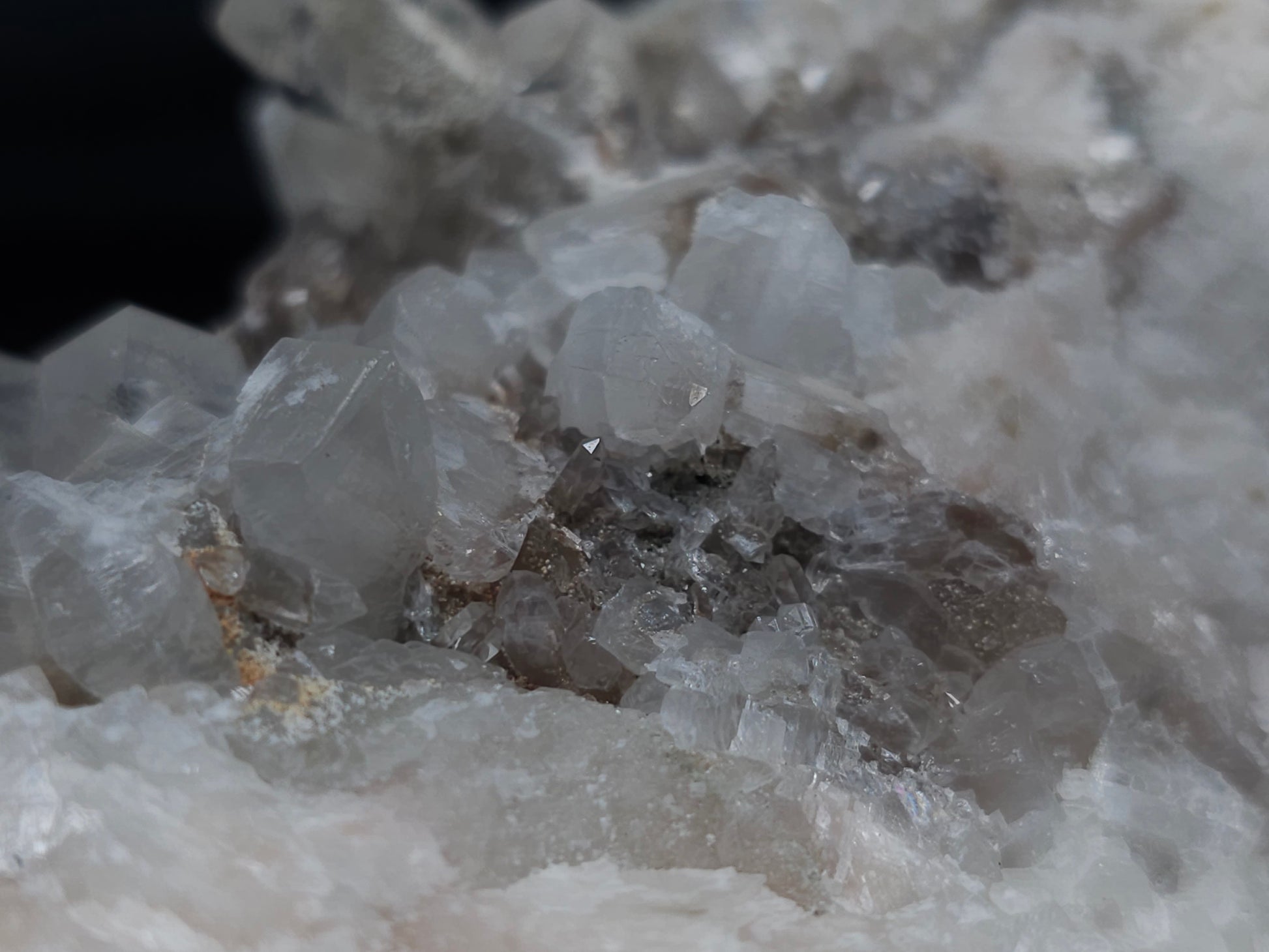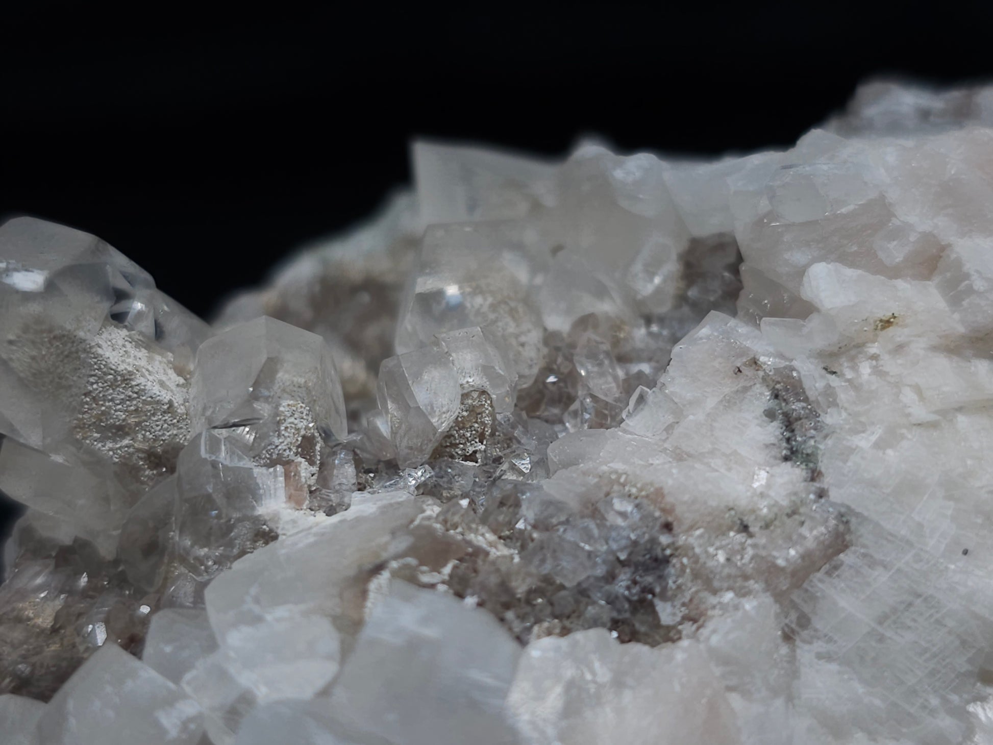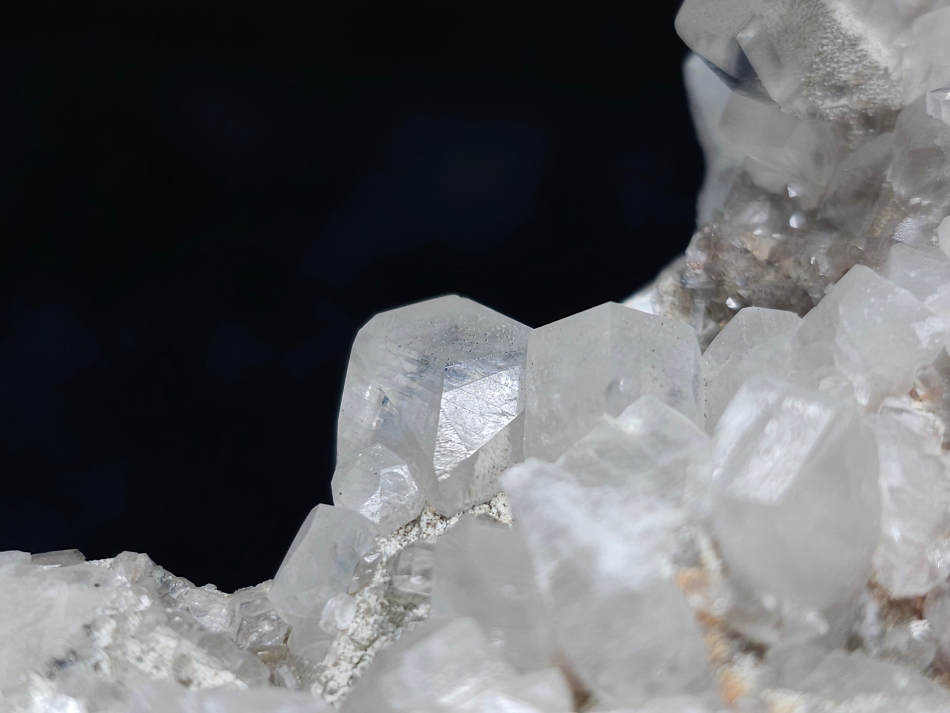 Experience the exceptional beauty of this rare formation: Behold the breathtaking sight of Dolomite intricately layered atop Combined form Calcite within clear Dogtooth Spar Calcite, accompanied by a cluster of clear Dogtooth Spar Calcite adorned with Hematite inclusions, all resting upon a matrix. Enhanced by the gentle glow of 365nm light, this specimen radiates a mesmerizing allure, inviting you to admire its unique charm.