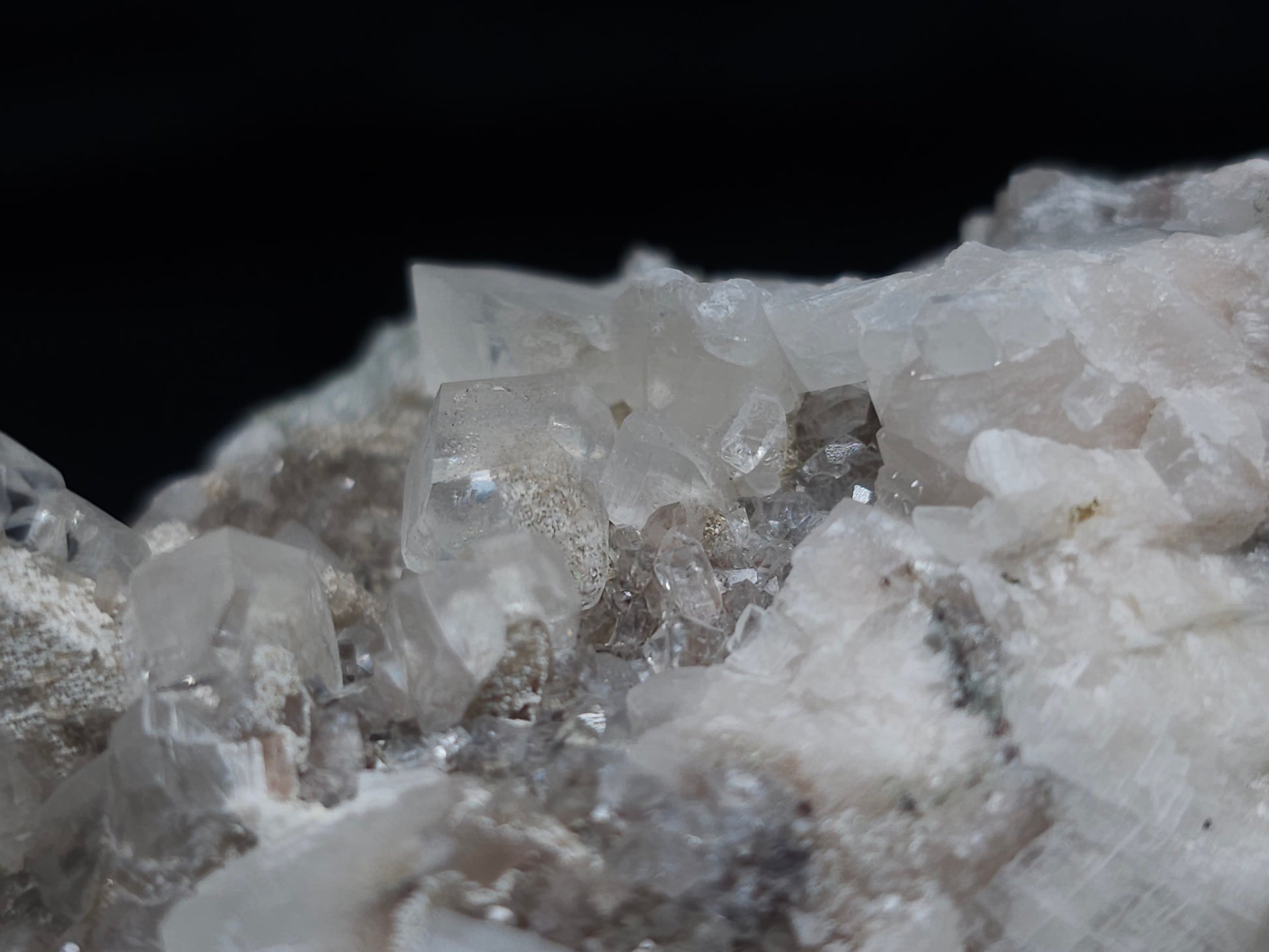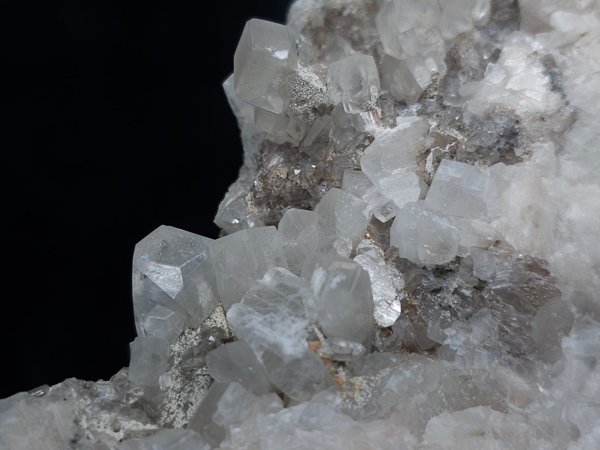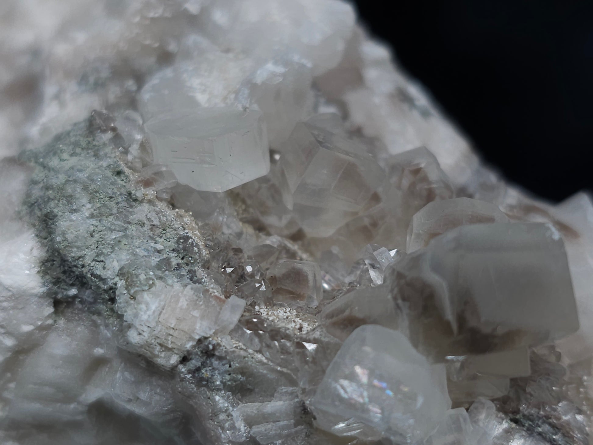 Experience the exceptional beauty of this rare formation: Behold the breathtaking sight of Dolomite intricately layered atop Combined form Calcite within clear Dogtooth Spar Calcite, accompanied by a cluster of clear Dogtooth Spar Calcite adorned with Hematite inclusions, all resting upon a matrix. Enhanced by the gentle glow of 365nm light, this specimen radiates a mesmerizing allure, inviting you to admire its unique charm.