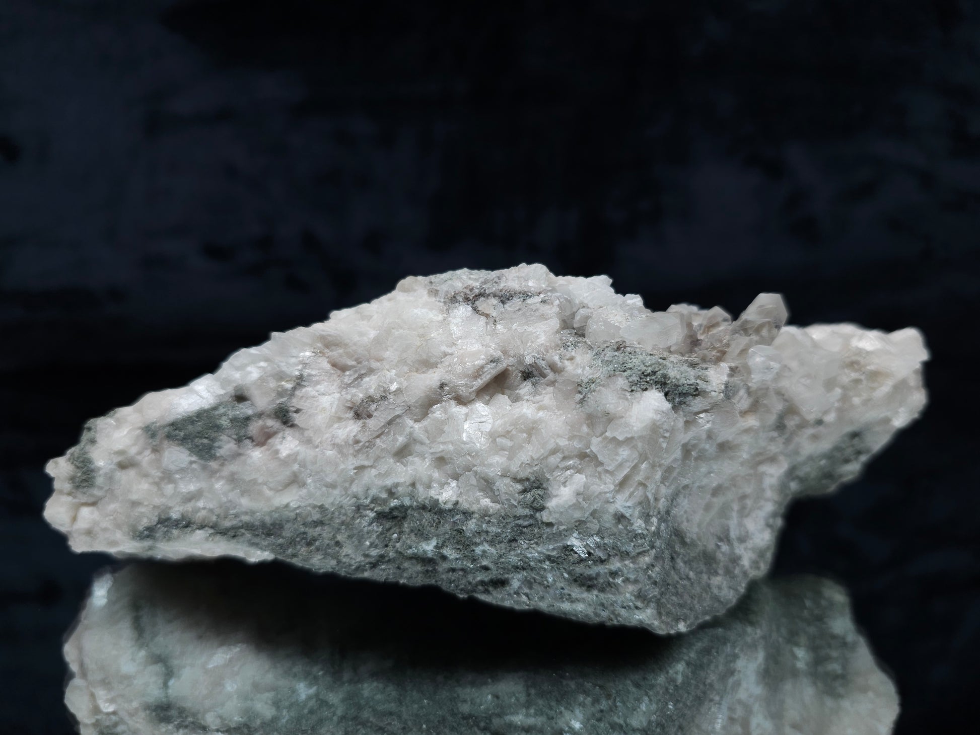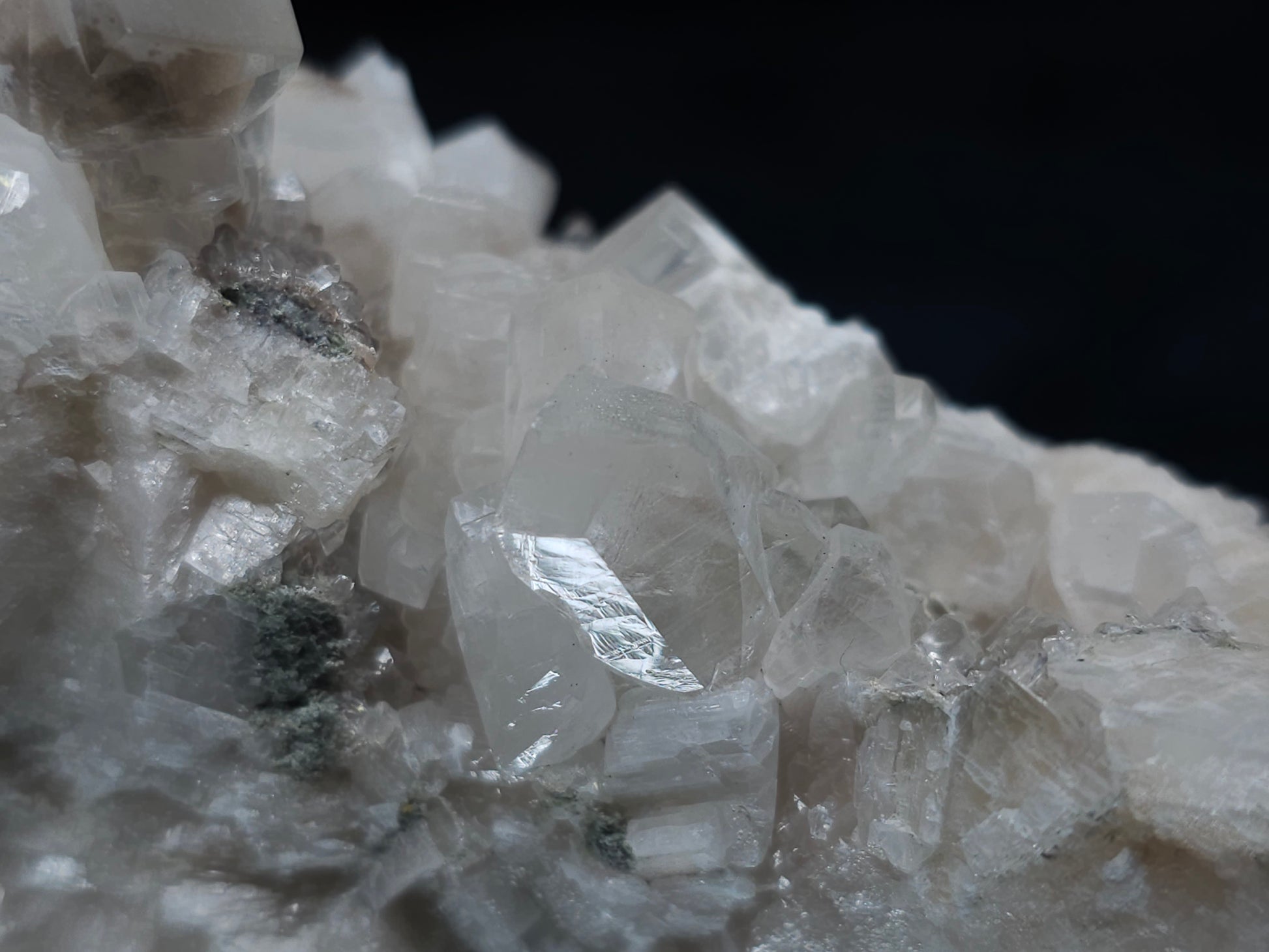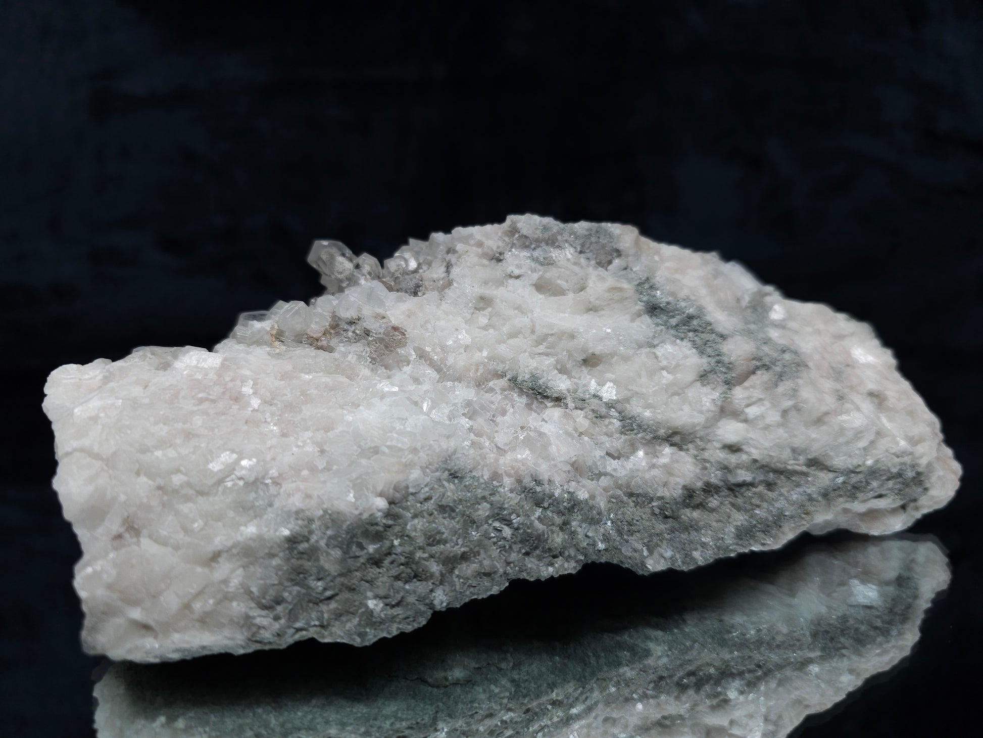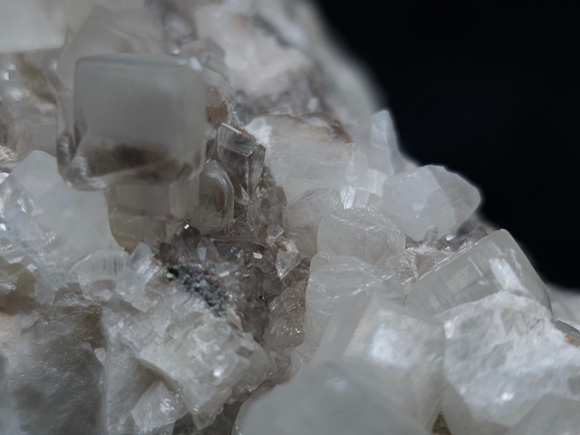 Experience the exceptional beauty of this rare formation: Behold the breathtaking sight of Dolomite intricately layered atop Combined form Calcite within clear Dogtooth Spar Calcite, accompanied by a cluster of clear Dogtooth Spar Calcite adorned with Hematite inclusions, all resting upon a matrix. Enhanced by the gentle glow of 365nm light, this specimen radiates a mesmerizing allure, inviting you to admire its unique charm.
