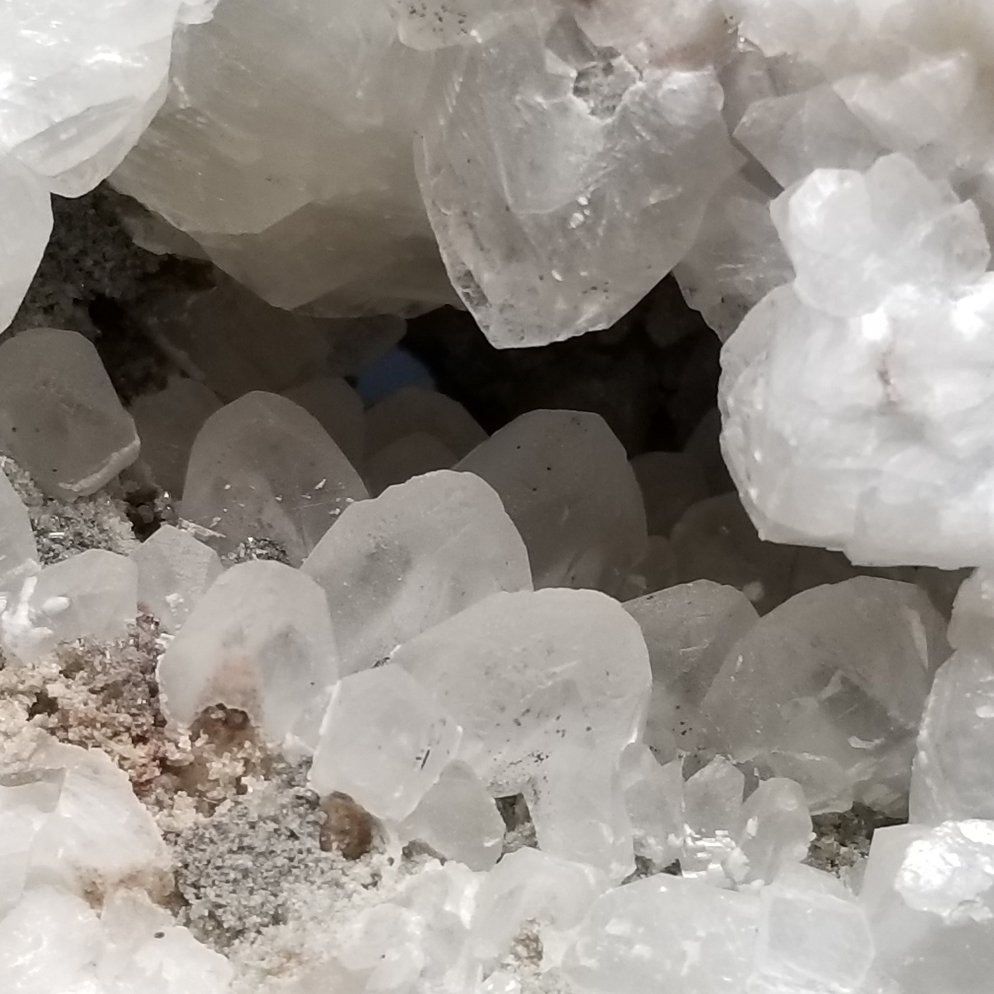 Marvel at the extraordinary beauty of this remarkable specimen: Witness the awe-inspiring sight of clear Combined form Calcite phantom adorned with Chalcopyrite inclusions, accompanied by Dogtooth Spar Calcite, set upon layers of white and pink Calcite atop a Sedimentary matrix. Enhanced by the gentle glow of 365nm light, this specimen exudes an enchanting allure, inviting you to explore its captivating intricacies.