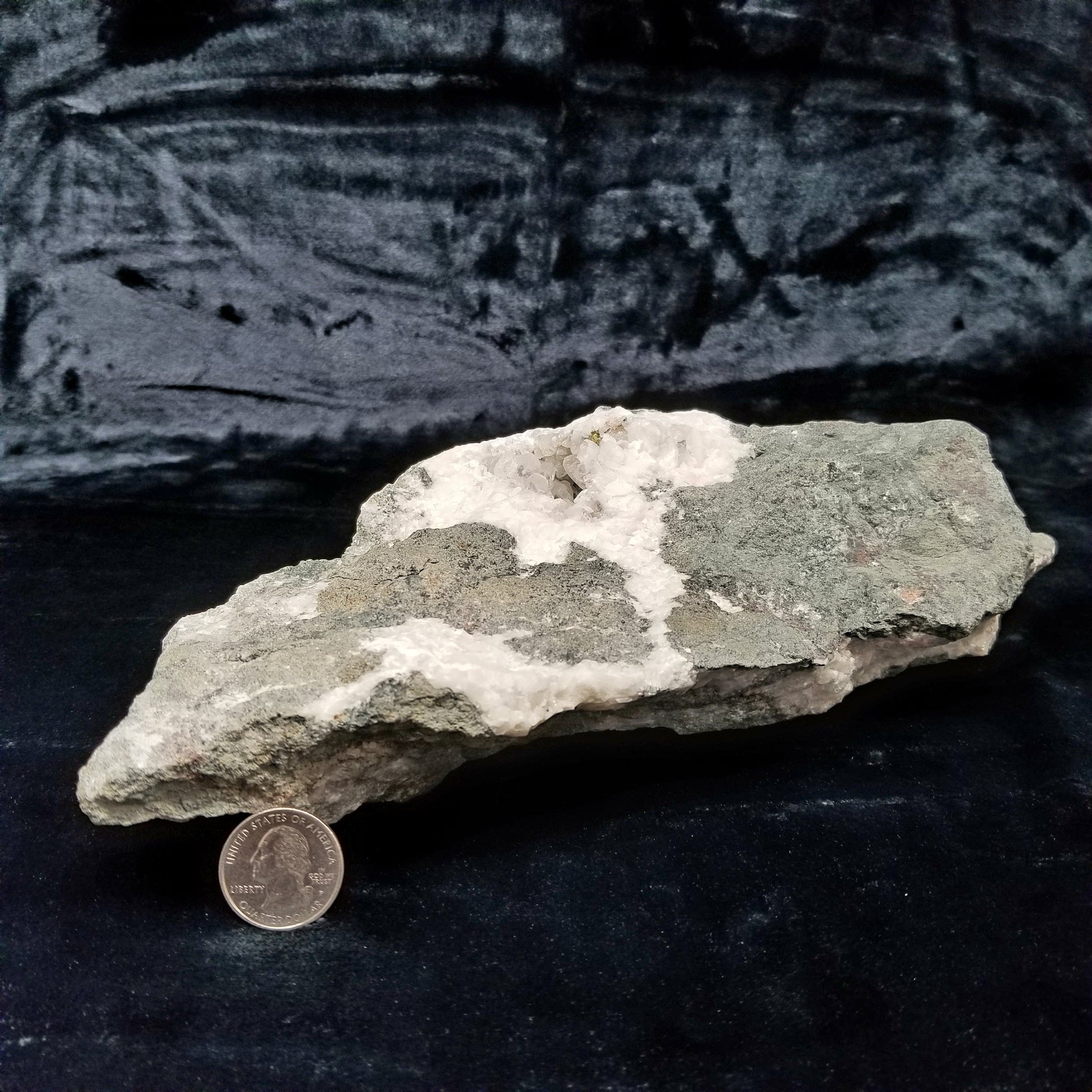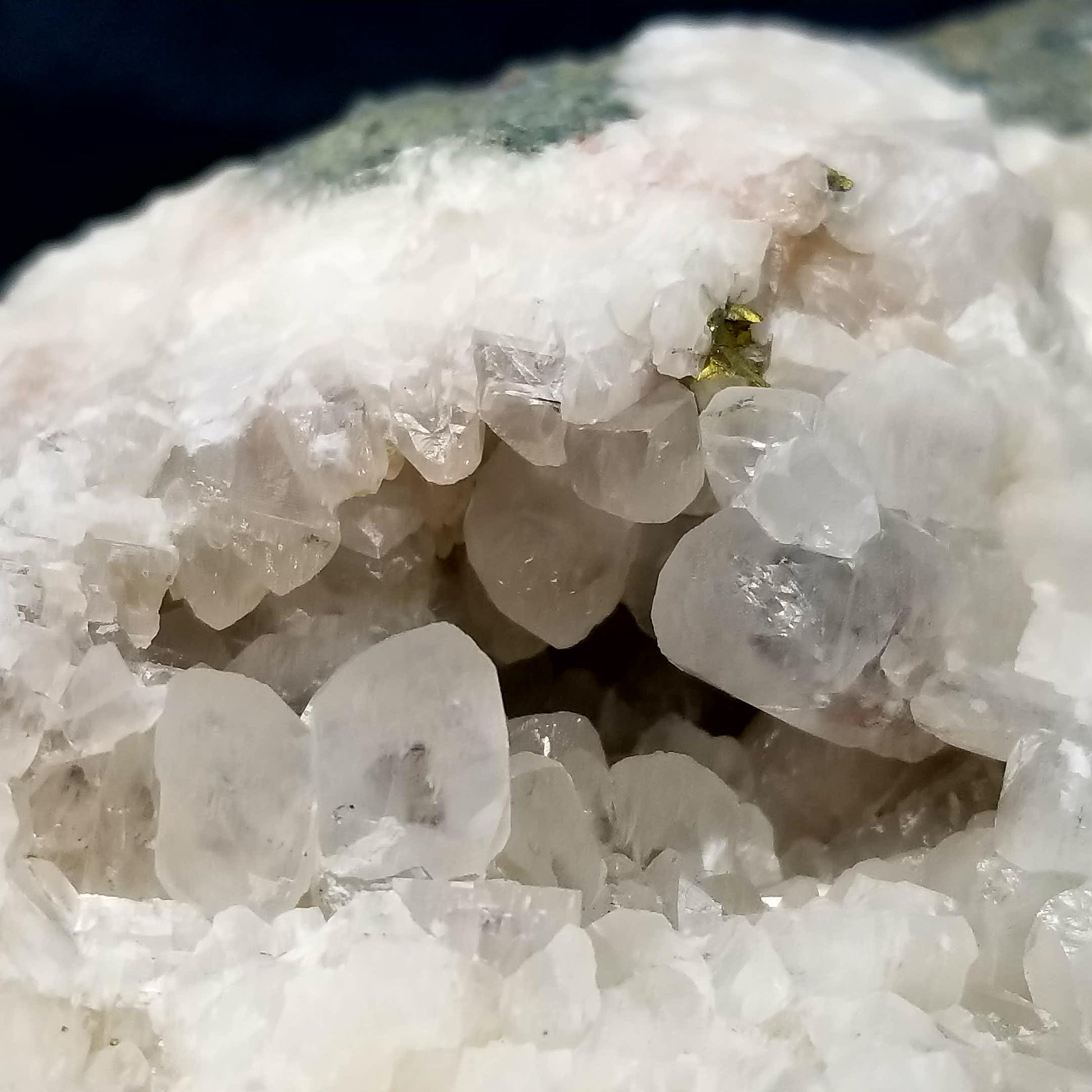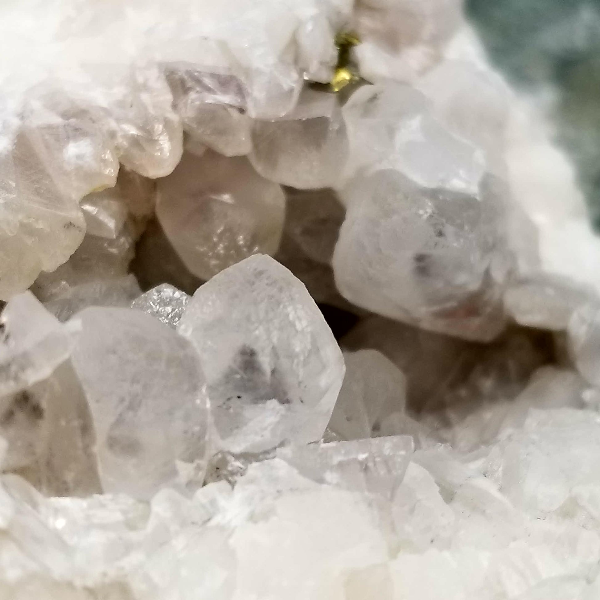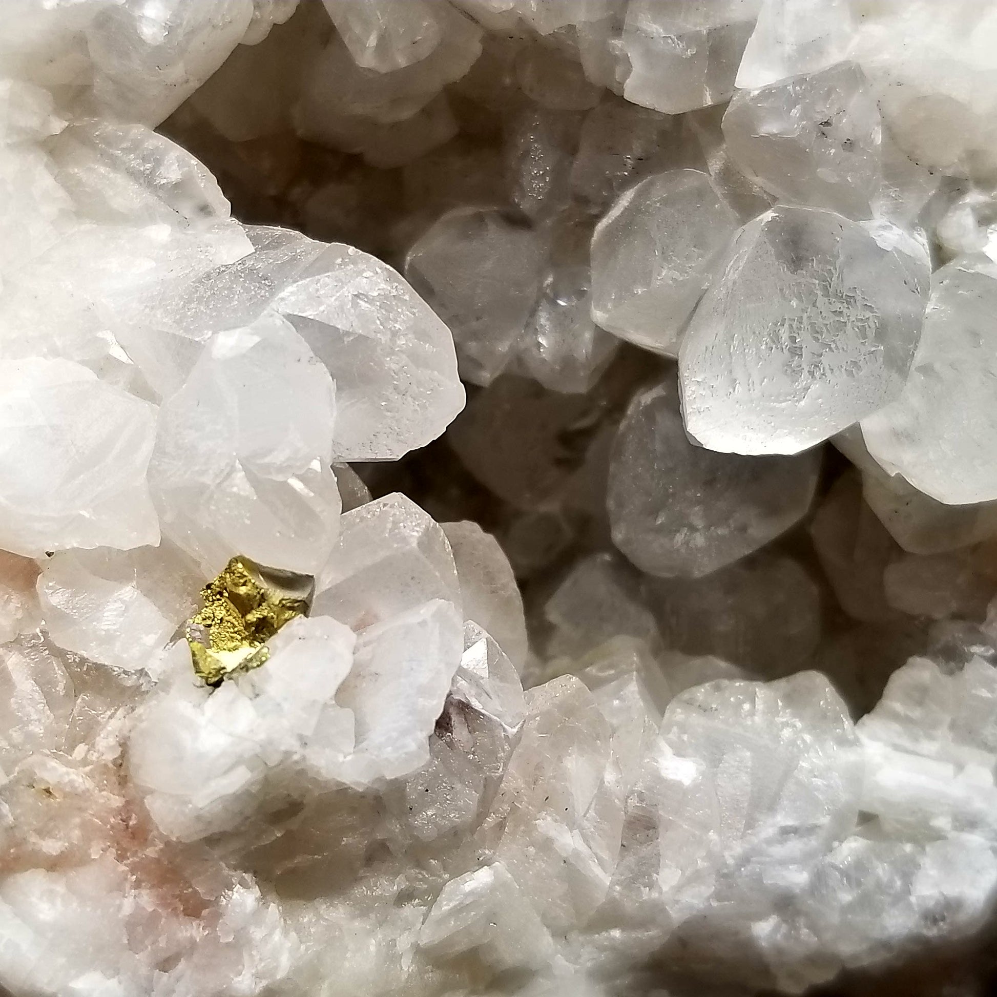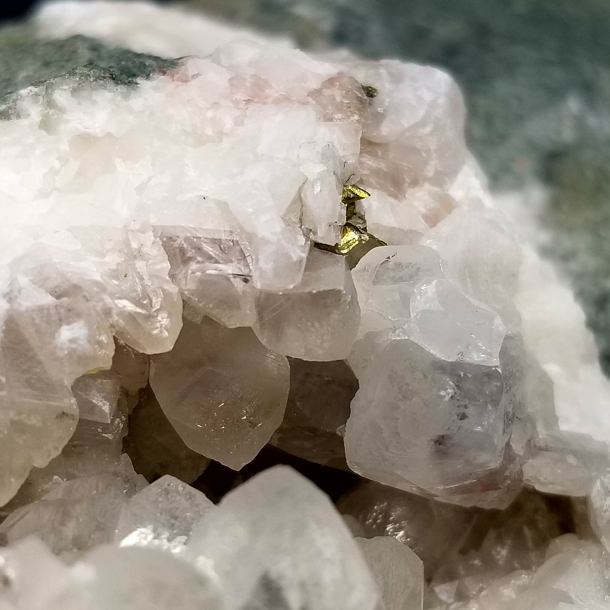 Experience the allure of this captivating specimen: Marvel at the captivating sight of Chalcopyrite ore delicately resting upon clear Combined form Calcite, accompanied by phantom Chalcopyrite inclusions, set against a backdrop of white Calcite and Sedimentary matrix. Enhanced by the gentle glow of 365nm light, this specimen exudes an enchanting allure, inviting you to appreciate its captivating radiance.