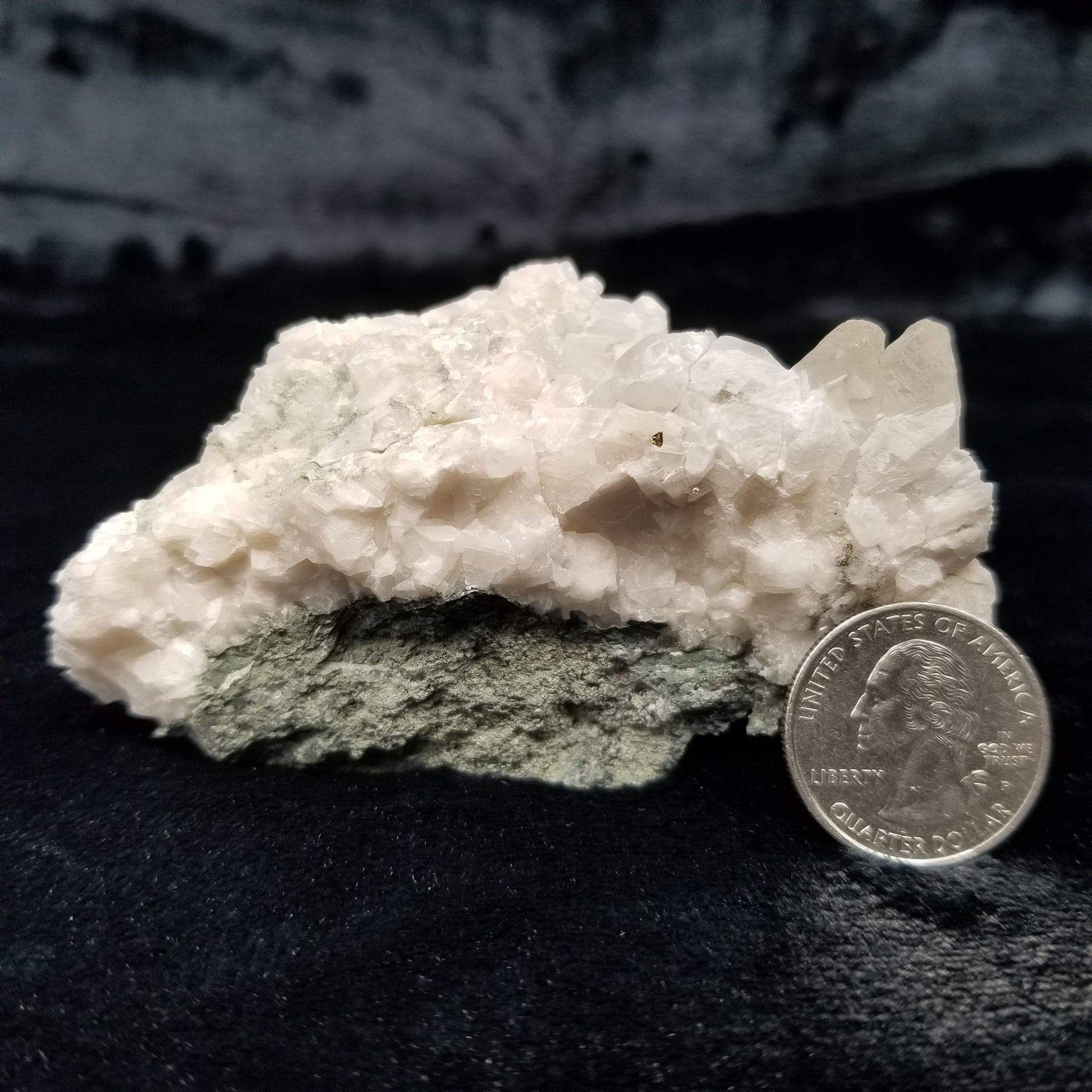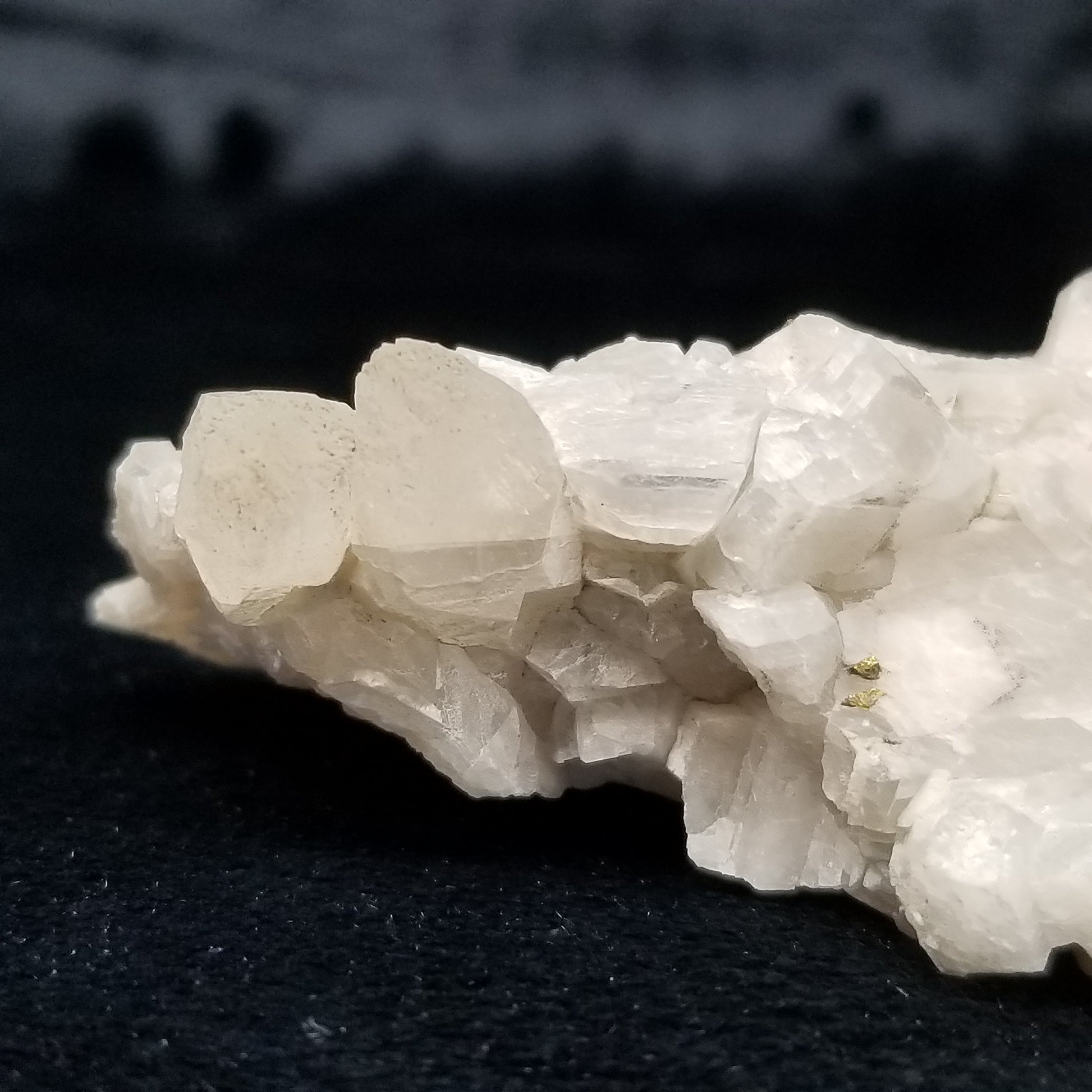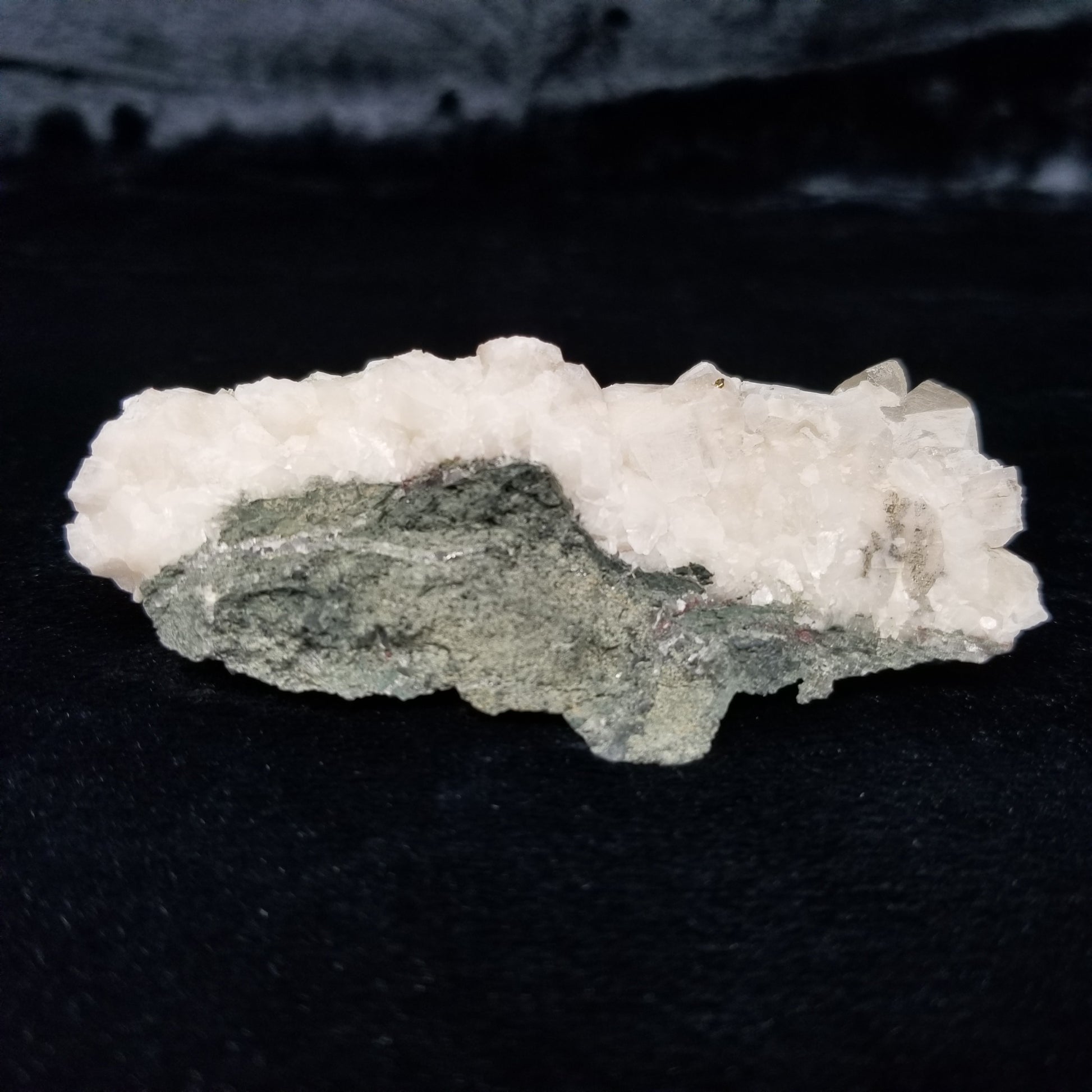 Marvel at the comely sight of Chalcopyrite gracing a clear Combined form Calcite cluster atop a Sedimentary matrix. Enhanced by the gentle glow of 365nm light, this specimen exudes an enchanting allure, inviting you to appreciate its captivating radiance.