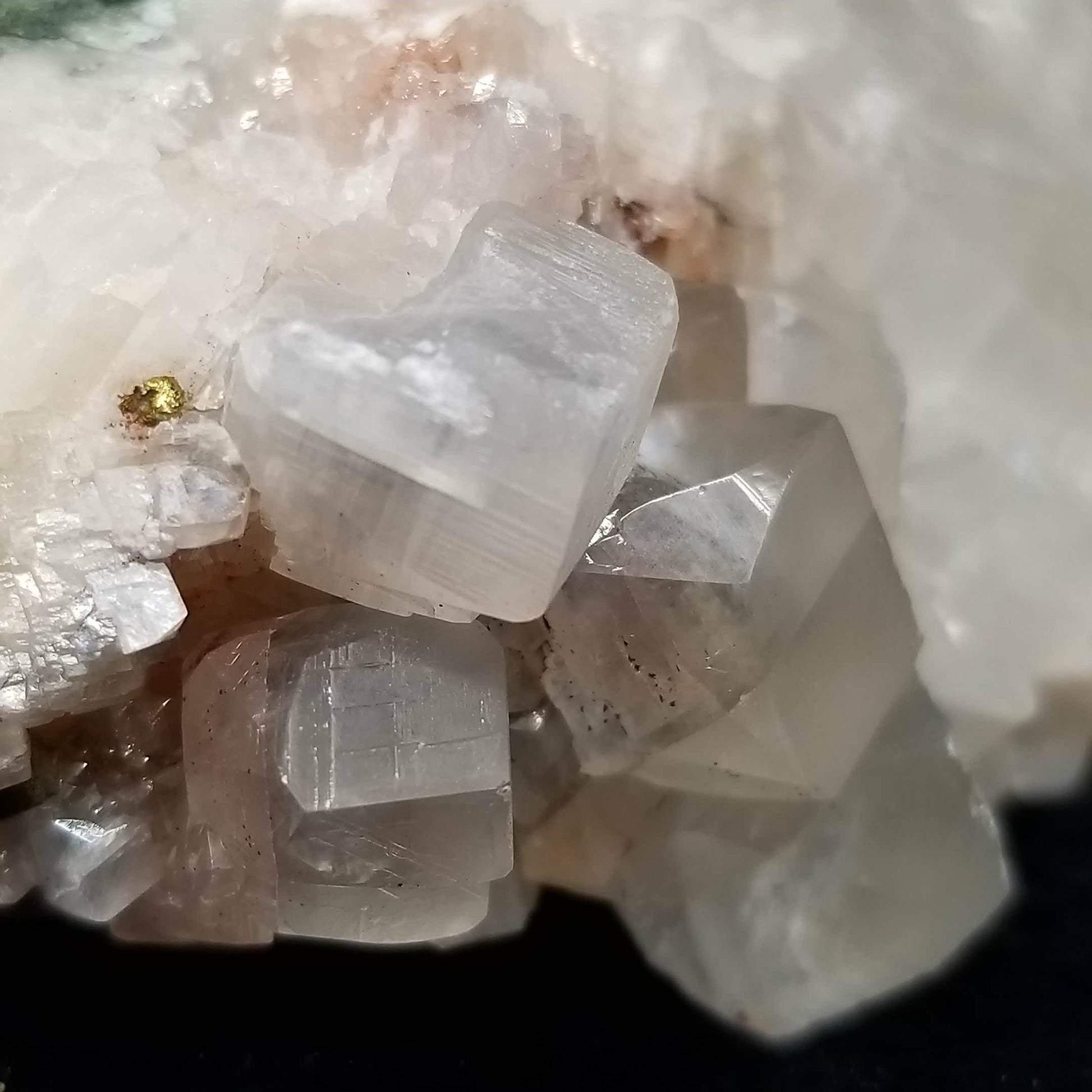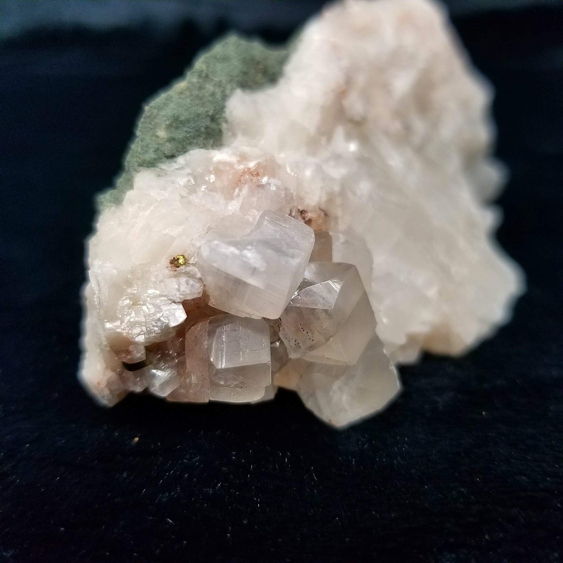 Be captivated by the alluring sight of Chalcopyrite gracing clear Combined form Calcite, adorned with Hematite phantom inclusions, set upon a Sedimentary matrix. Enhanced by the gentle glow of 365nm light, this specimen emanates an enchanting allure, inviting you to marvel at its captivating radiance.