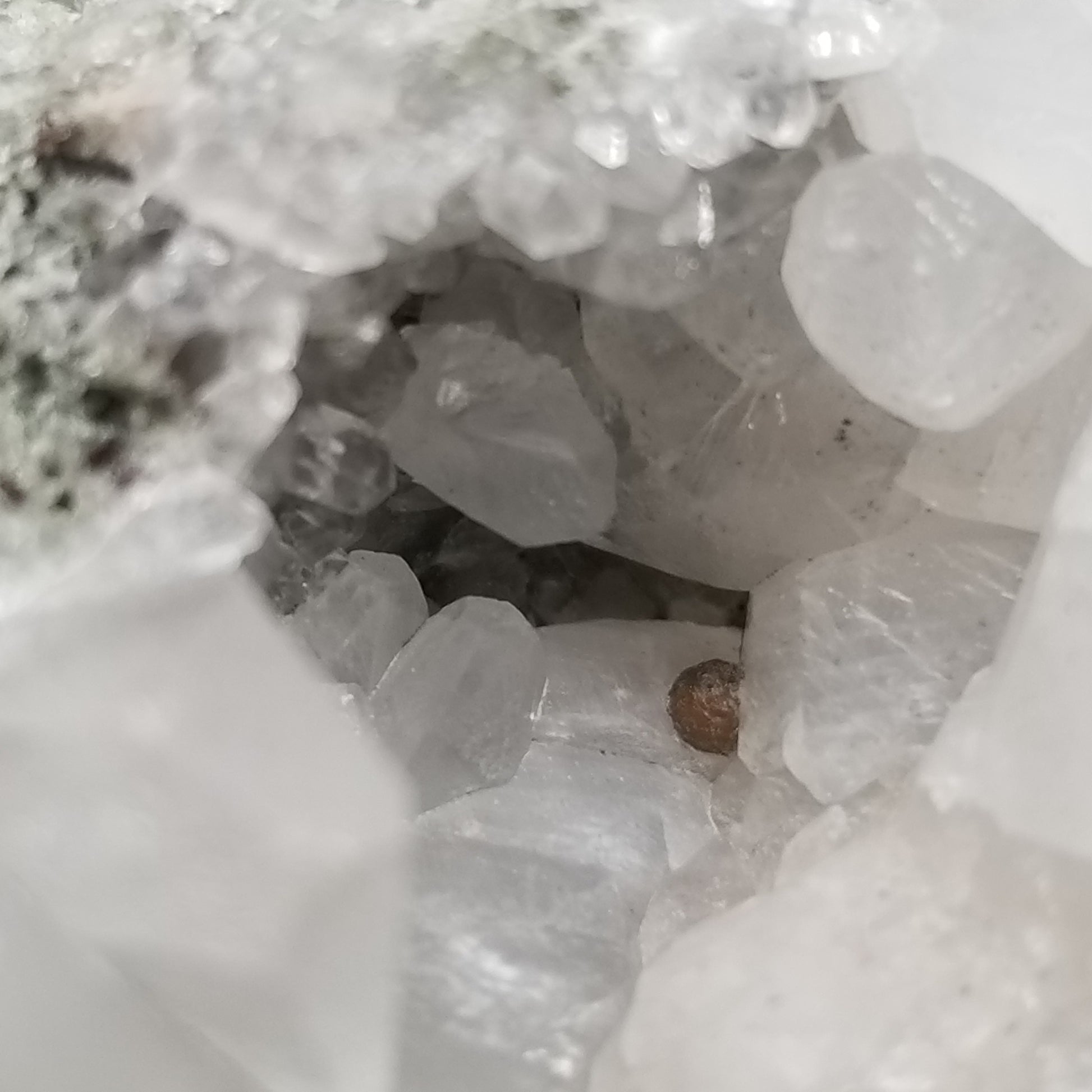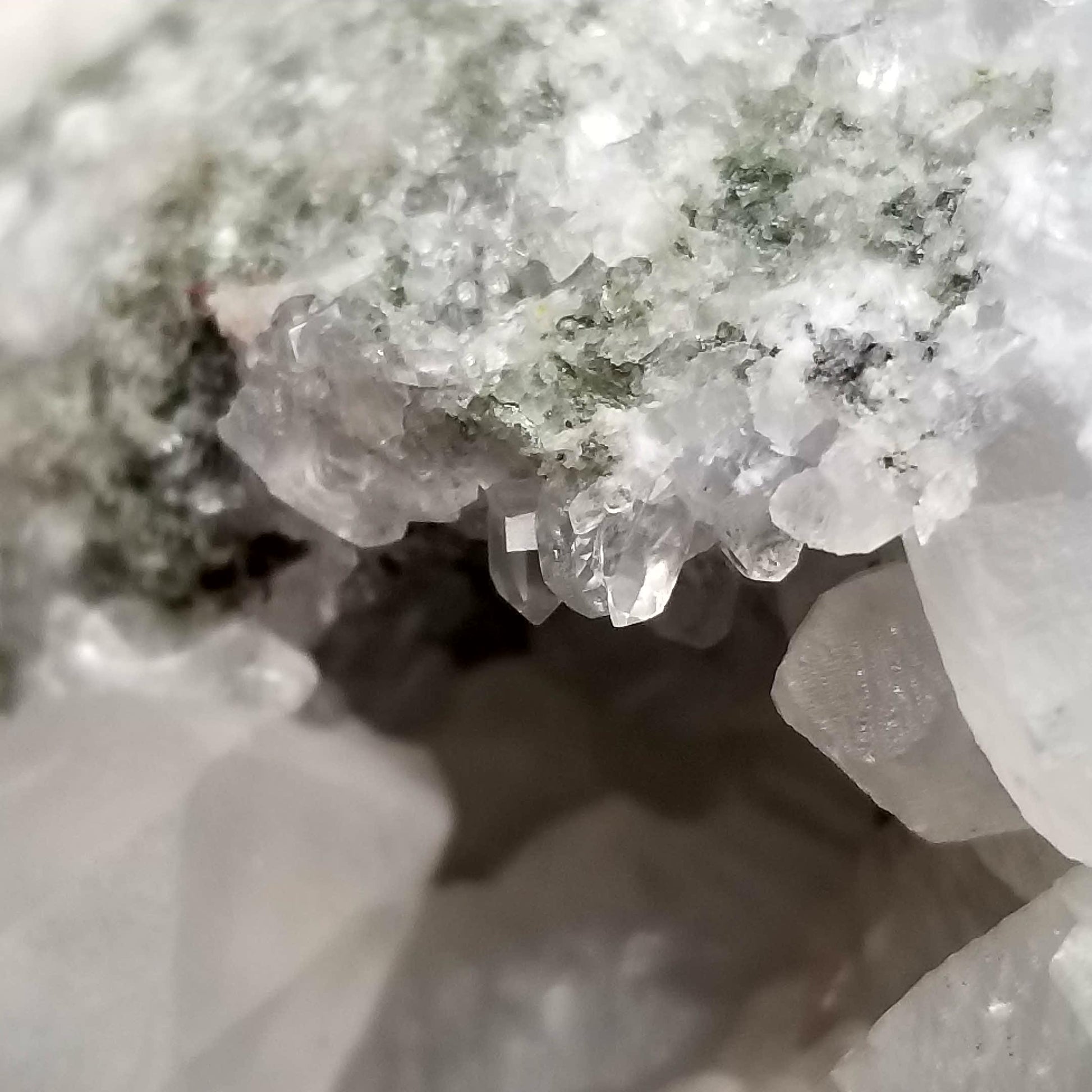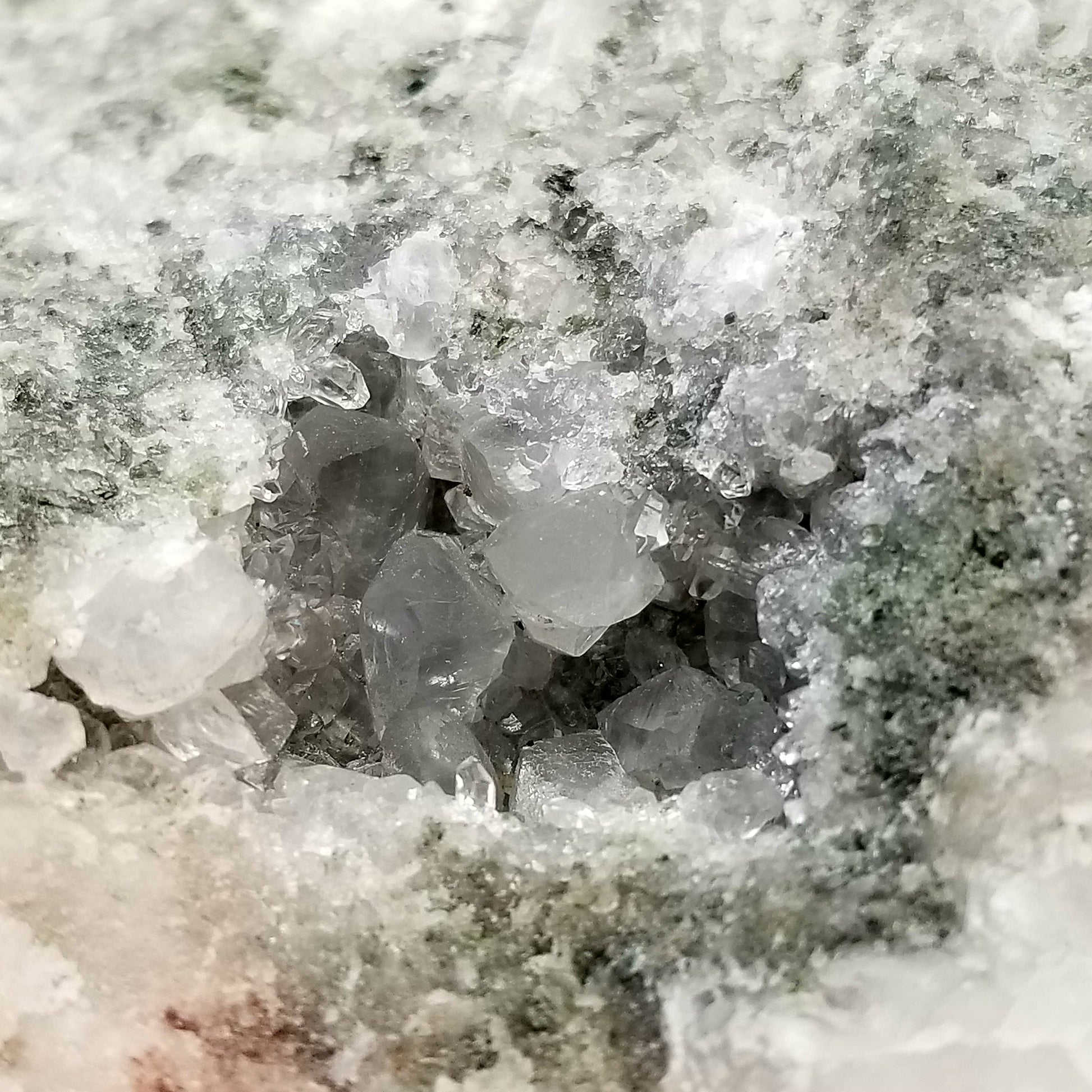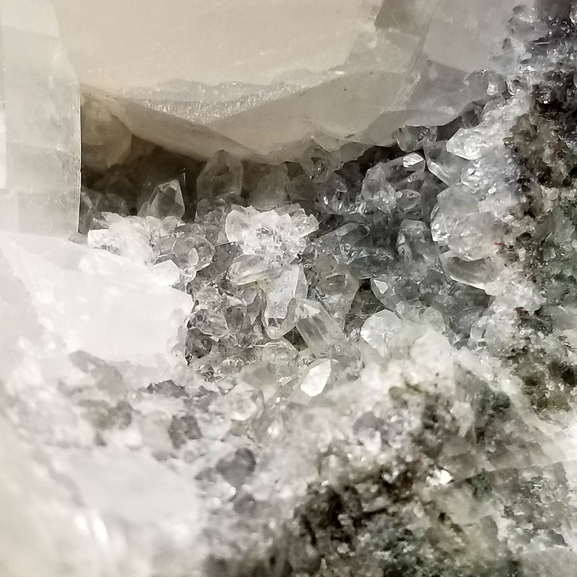 Delight in the charm of clear Combined form Calcite adorned with small Spirit Quartz formations, set upon a Sedimentary matrix. Enhanced by the gentle glow of 365nm light, this specimen exudes an enchanting allure, inviting you to appreciate its captivating radiance.