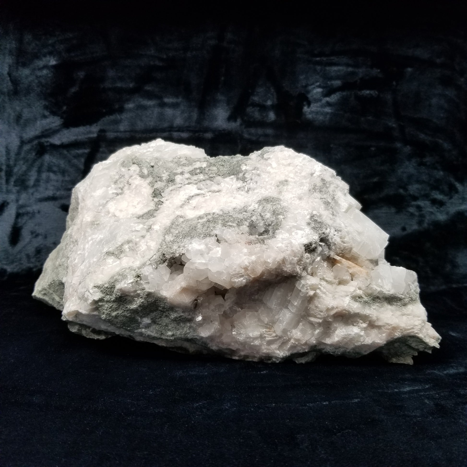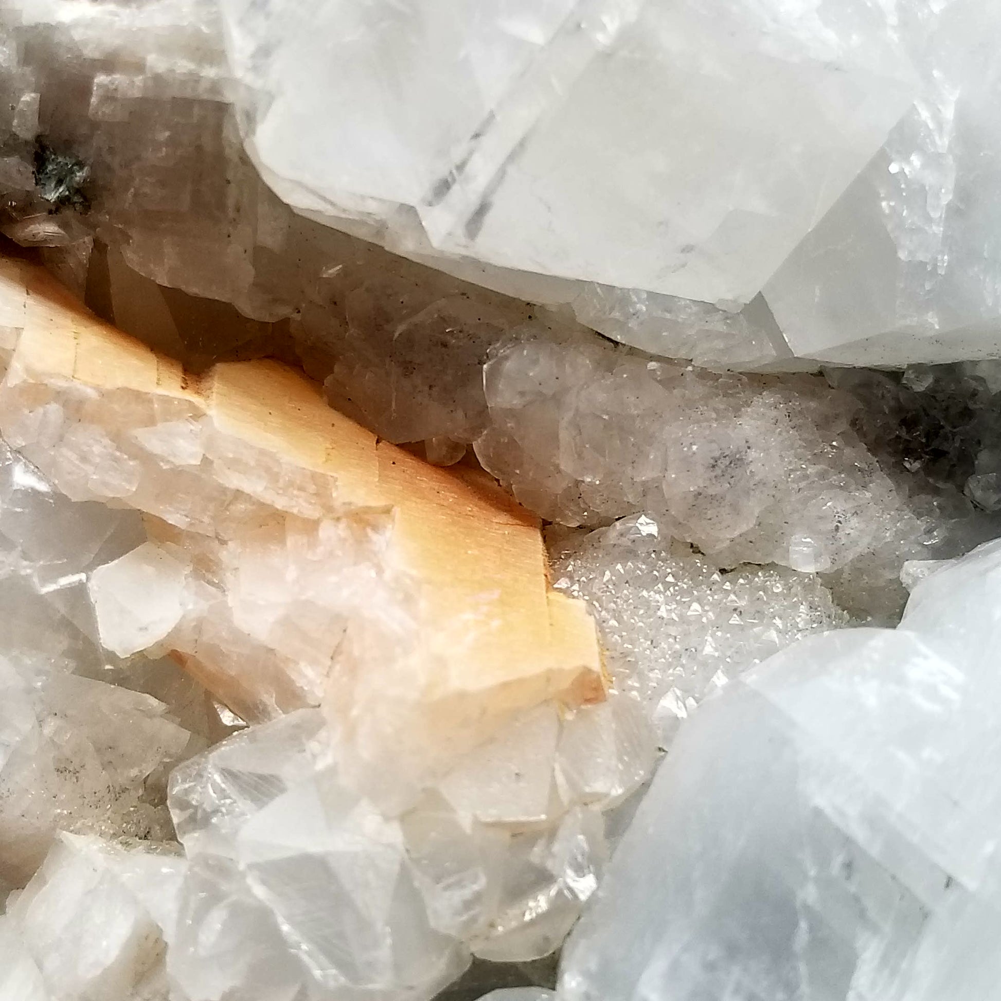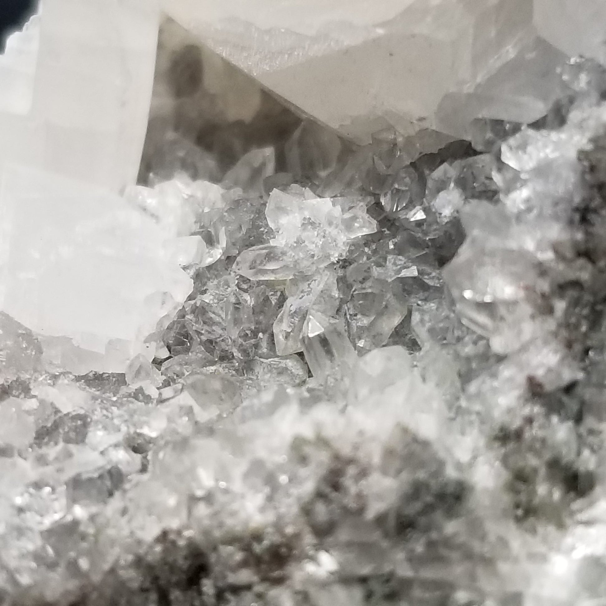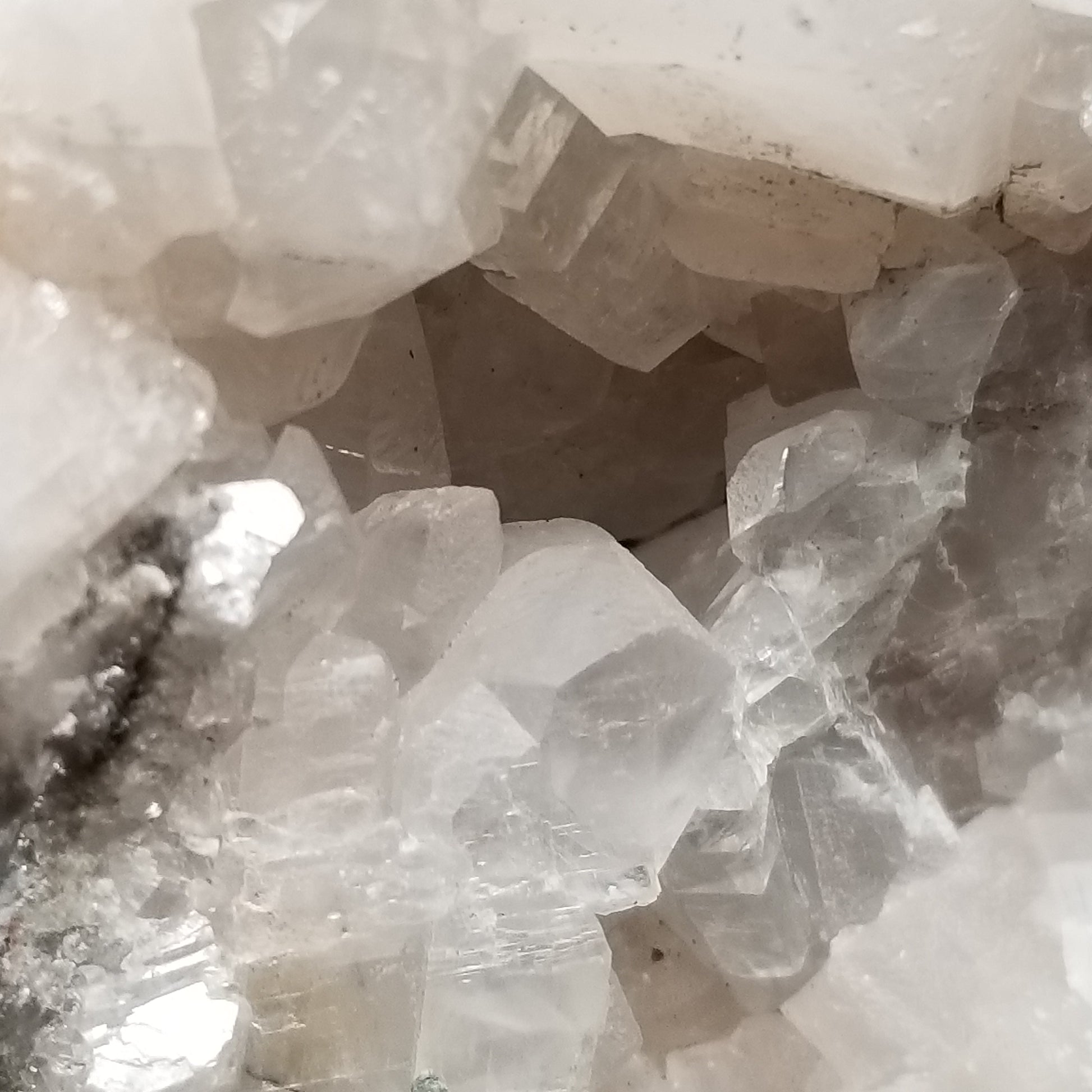 Delight in the charm of clear Combined form Calcite adorned with small Spirit Quartz formations, set upon a Sedimentary matrix. Enhanced by the gentle glow of 365nm light, this specimen exudes an enchanting allure, inviting you to appreciate its captivating radiance.