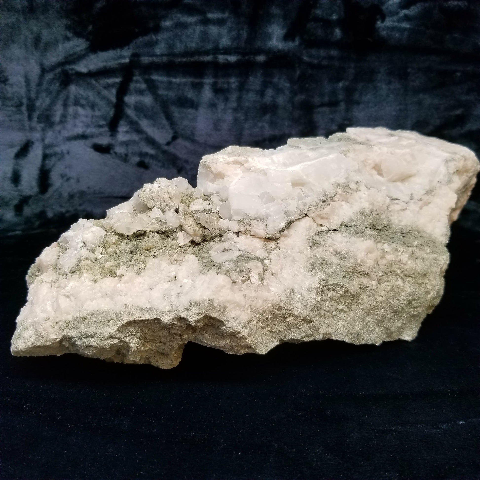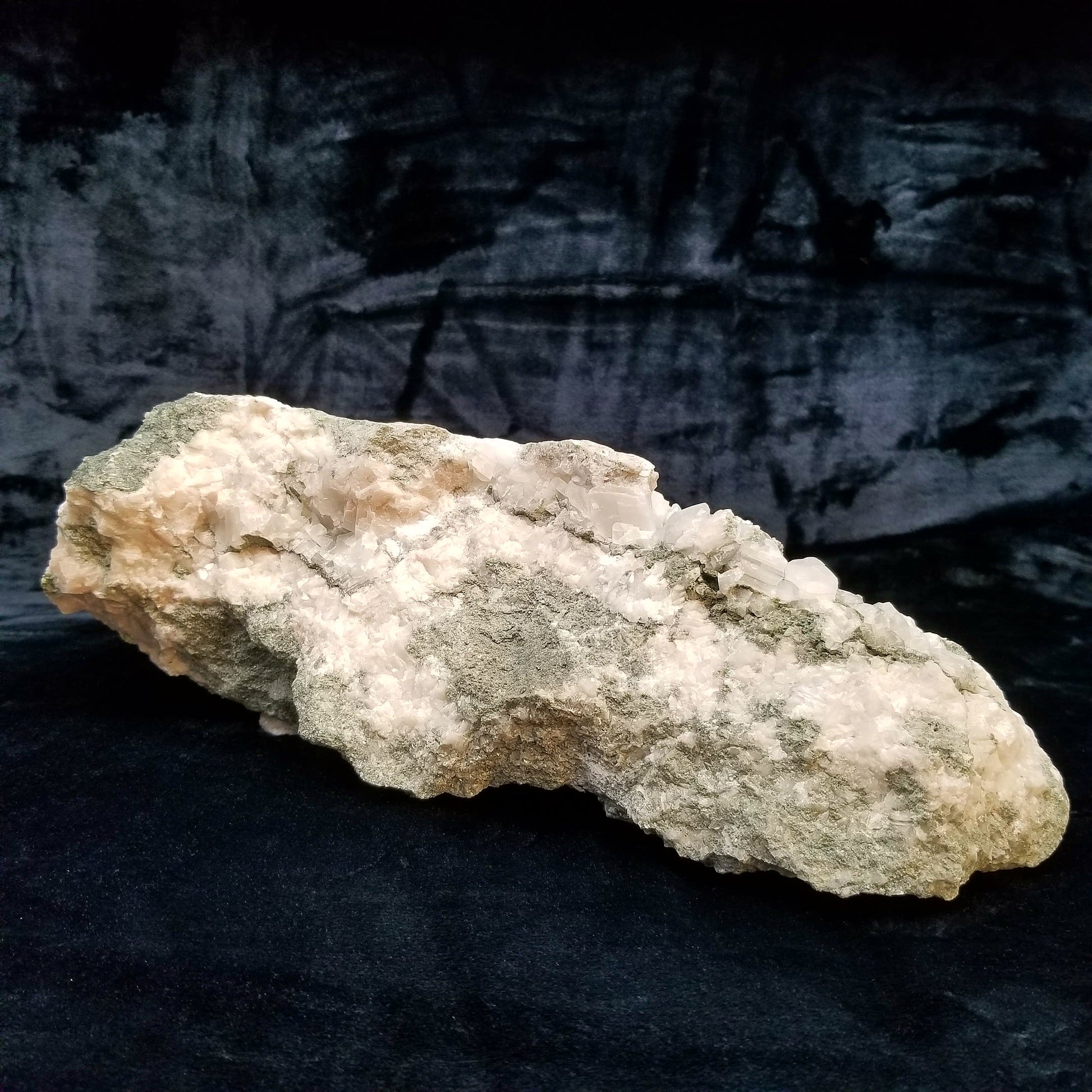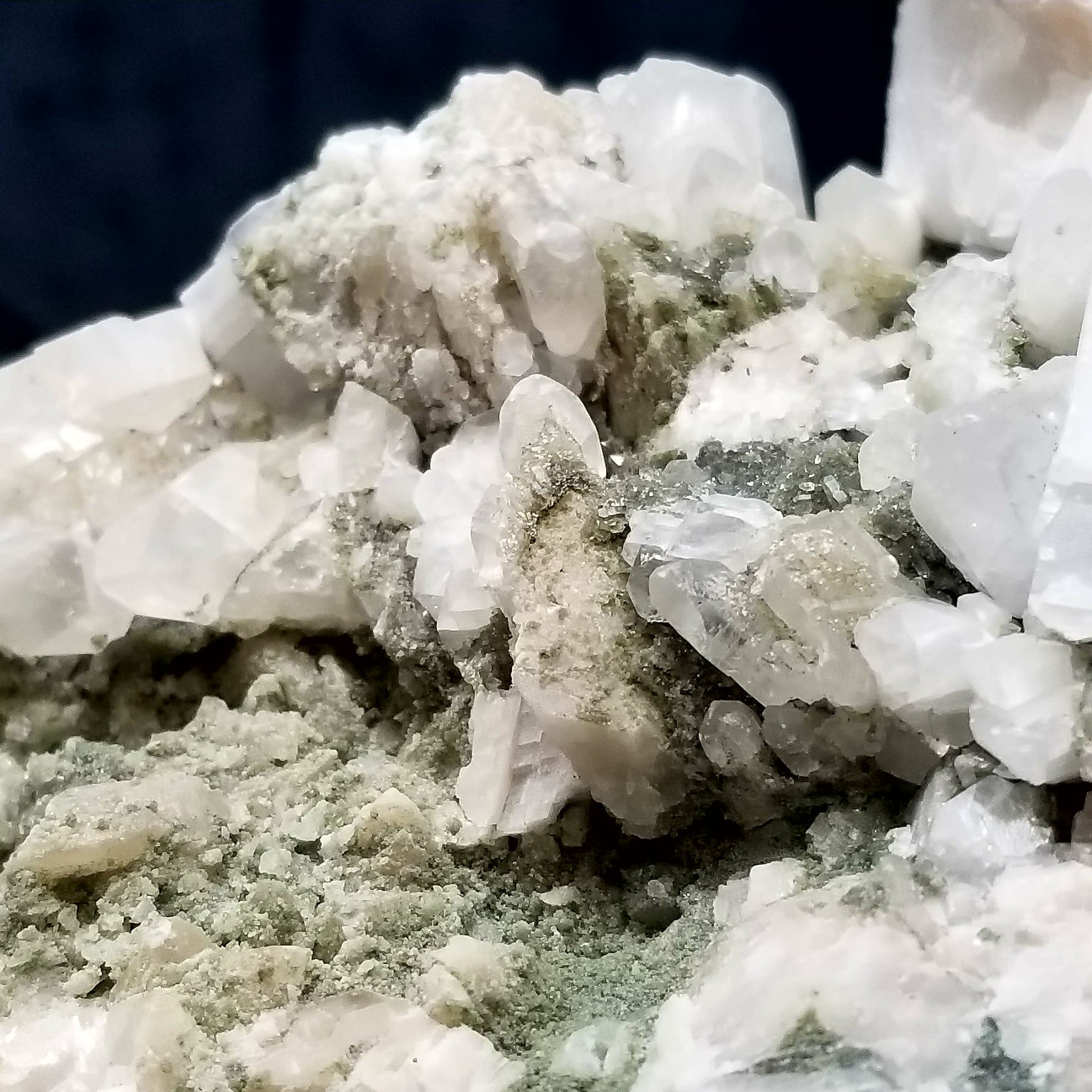 Immerse yourself in the allure of this captivating specimen featuring alluring white and clear Dogtooth Spar Calcite formations, adorned with delicate small Spirit Quartz formations, elegantly set upon a matrix base. Each element intertwines to create a mesmerizing display of natural beauty and harmony. And when illuminated by the enchanting glow of 365nm light, this specimen unveils its radiant charm, casting a spell of fascination and wonder. A true testament to the marvels of nature, this exquisite treasure is sure to captivate collectors and enthusiasts alike, inviting them to delve deeper into its mystical allure.