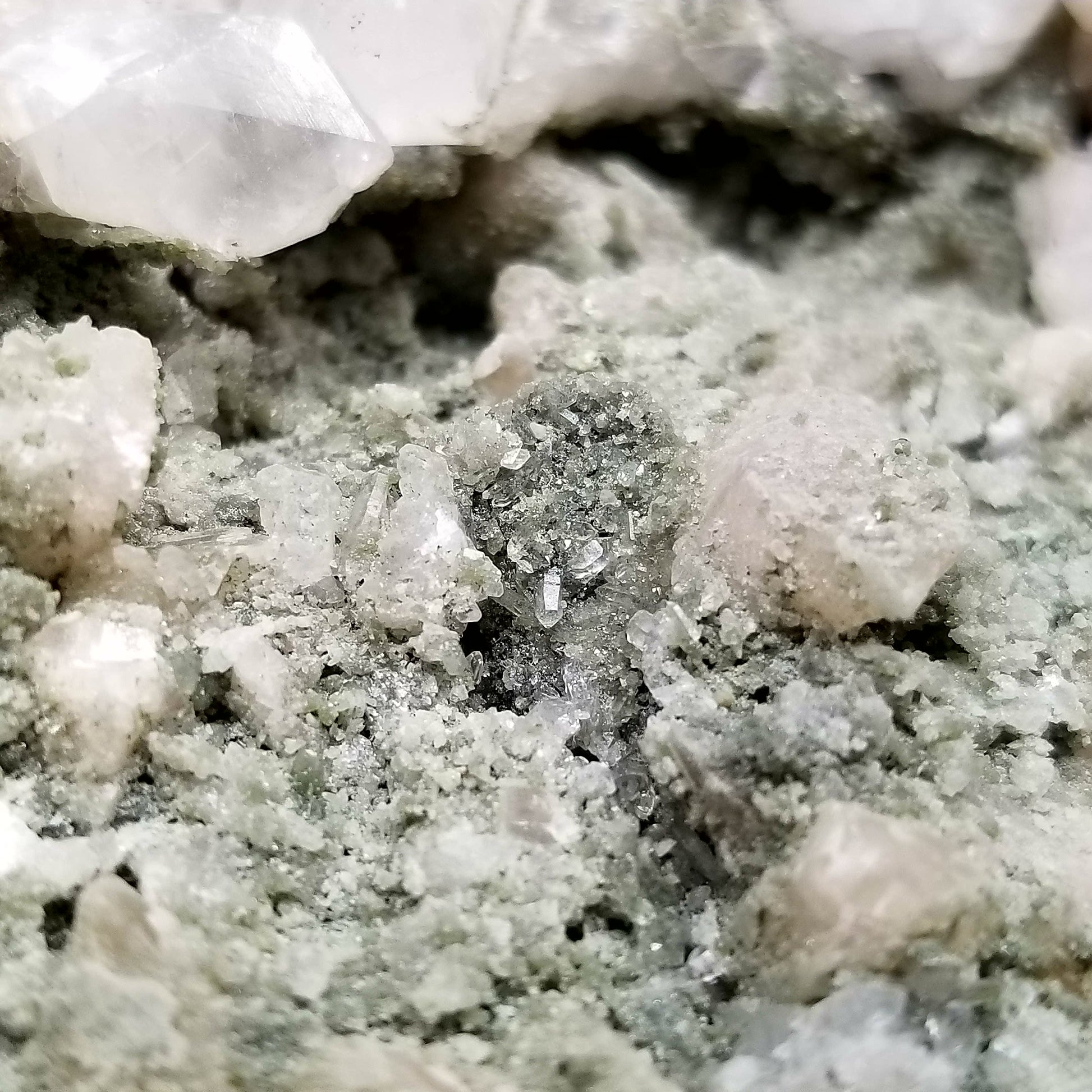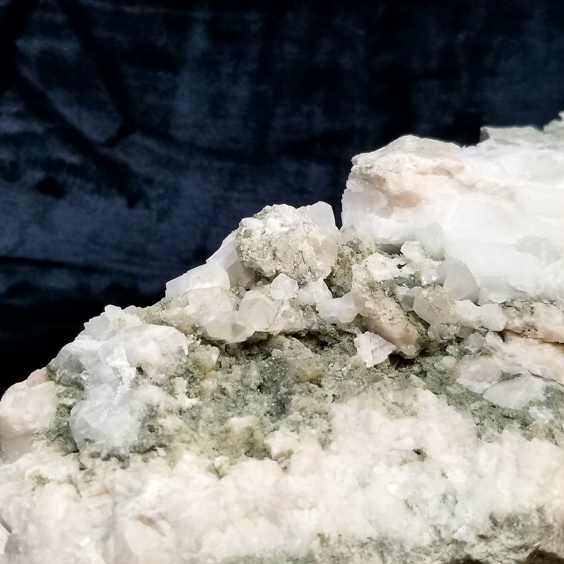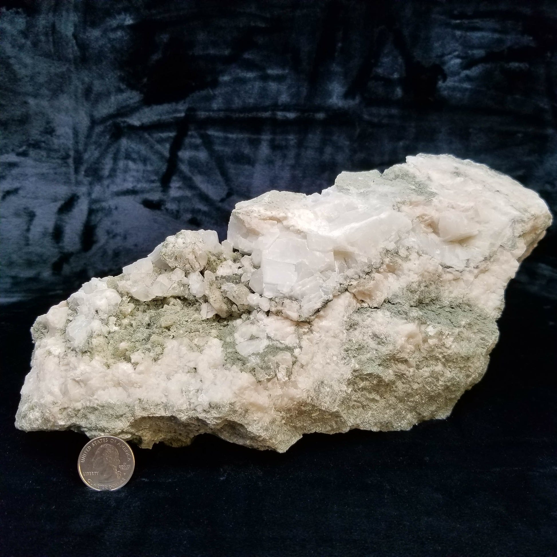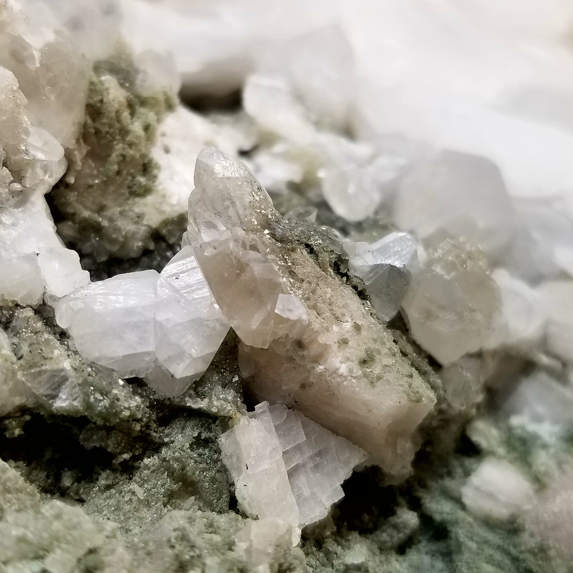Immerse yourself in the allure of this captivating specimen featuring alluring white and clear Dogtooth Spar Calcite formations, adorned with delicate small Spirit Quartz formations, elegantly set upon a matrix base. Each element intertwines to create a mesmerizing display of natural beauty and harmony. And when illuminated by the enchanting glow of 365nm light, this specimen unveils its radiant charm, casting a spell of fascination and wonder. A true testament to the marvels of nature, this exquisite treasure is sure to captivate collectors and enthusiasts alike, inviting them to delve deeper into its mystical allure.