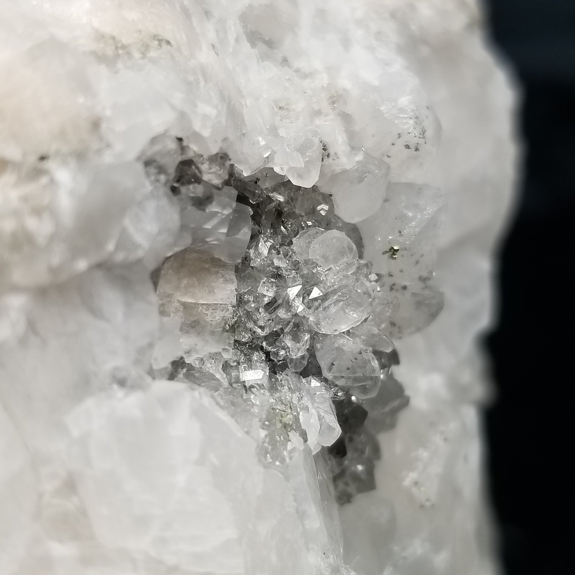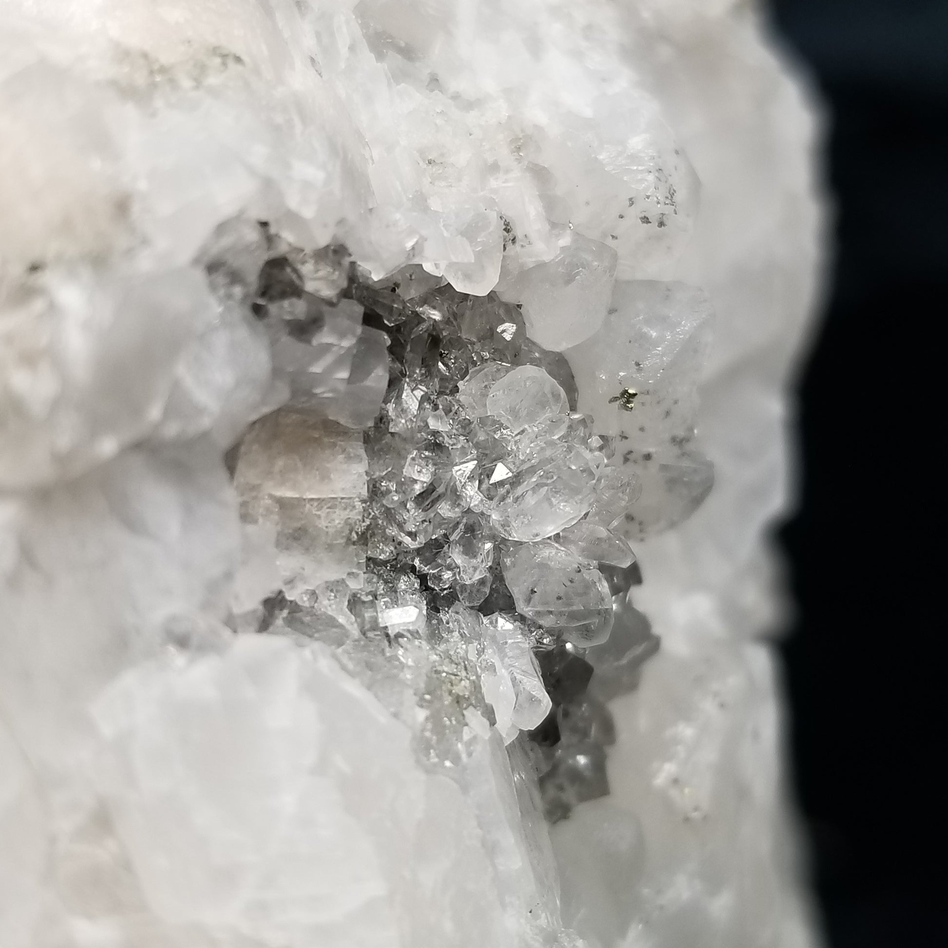 Marvel at the breathtaking sight of Chalcopyrite gracing small, super clear Spirit Quartz formations, adorned with Chalcopyrite inclusions, alongside white Combined form Calcite with Chalcopyrite inclusions, all set upon a mesmerizing matrix. This specimen emanates an enchanting glow under 365nm light, casting a spellbinding aura that captivates all who behold its beauty.